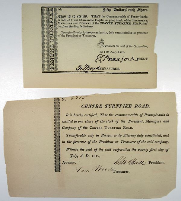 Pennsylvania. Lot includes 2 pieces: 1821 One Share U/U Capital Stock Certificate in Fine condition; 1812 One Share I/U Capital Stock Certificate in Fine Condition. Centre Turnpike, also known as the Reading-Sunbury Road, was an early United States turnpike located in Pennsylvania. It followed the path of the King's Highway, which had been surveyed in 1770 by Francis Yarnall. Running from Reading to Sunbury, it was 75 miles (121 km) long, was started in 1808, and was completed around 1814 at a cost of US$208,000. The final toll was collected near Bear Gap in Ralpho Township in 1855. The general path of the original turnpike is now covered partly by Pennsylvania Route 61 and Pennsylvania Route 54. It was maintained and controlled by the Centre Turnpike Road Company, which was formed on March 25, 1805. (2)