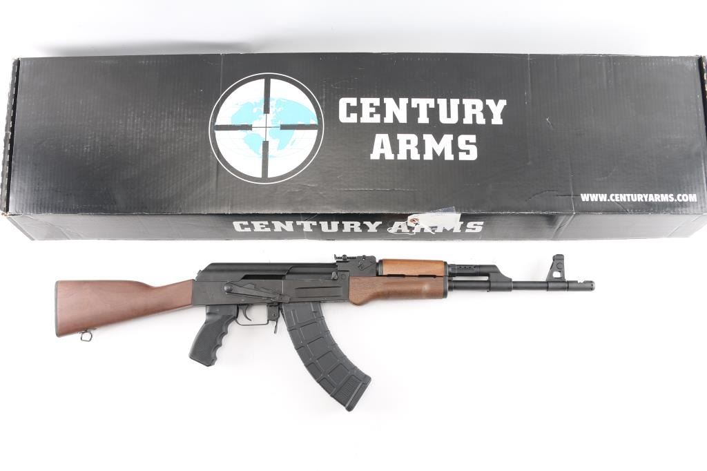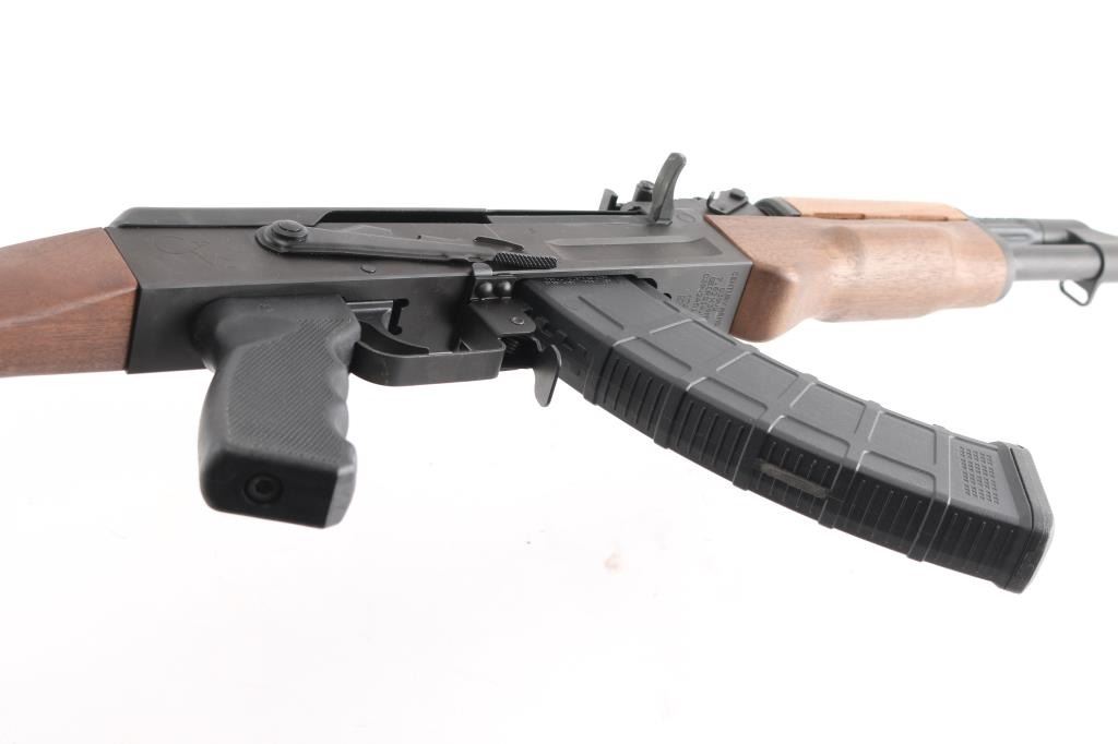 SN: C39V2A51160. The "American AK". Milled receiver, gas piston semiautomatic carbine. Hard chrome-lined hammer forged barrel, side mount scope rail and accepts double stack magazines. Black nitrite finish, standard AKM front sight and tangent rear sight. 16.5" barrel, 18" with muzzle break. Wood stocks, MOE 30 rd magazine. Bore is pristine, rifle is in like new condition, comes in factory box with matching label and manual.
