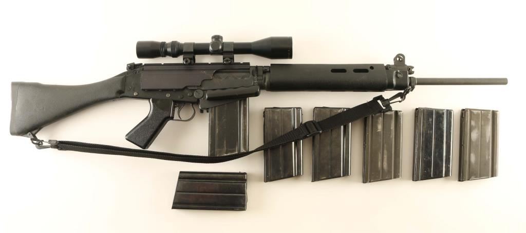 Semi-automatic L1A1 pattern rifle chambered in 7.62x51mm NATO, manufactured in Canada utilizing original British parts with newly manufactured barrel & type three receiver. Imported by C.A.I. of St. Albans, VT with import stamp on the underside of the barrel. Features a parkerized & black painted finish, 20.5” non-threaded barrel, elevation adjustable shrouded post front sight, fully-adjustable folding aperture rear sight on sliding rail, aftermarket scope rail top cover with attached Simmons Whitetail 3-9x scope, adjustable gas system, smooth trigger, folding charging handle, three position selector, black nylon ‘sling’, detachable 20 round magazine, grooved black synthetic carry handle and textured black synthetic stock set including ventilated handguard, pistol grip and fixed shoulder stock. Includes six spare magazines. Rifle retains approximately 95% of its collective finishes showing scattered handling marks, edge wear and some light scattered surface rust around the gas block. Action is sound, the optics are clear with duplex reticle, the bore is excellent and the stocks are very good. Condition is near NRA Very Good. ***Modern Firearm***