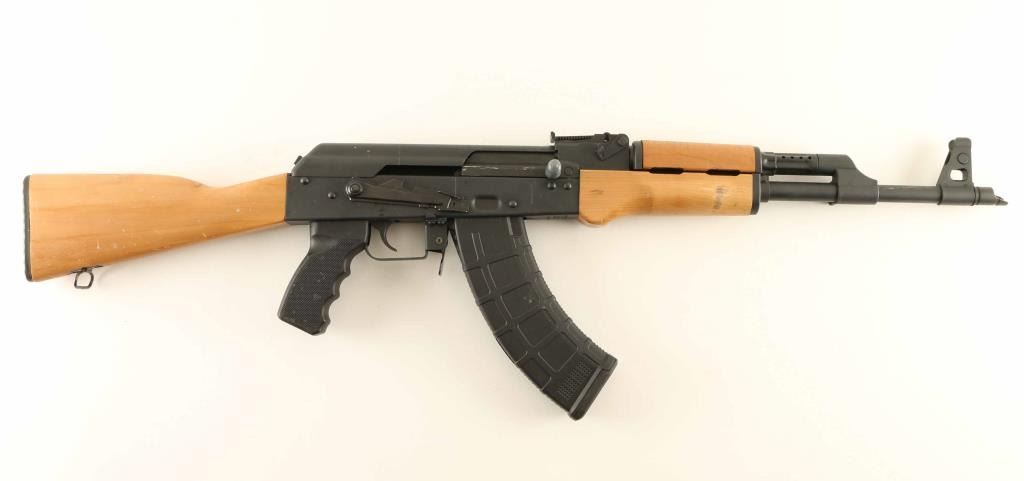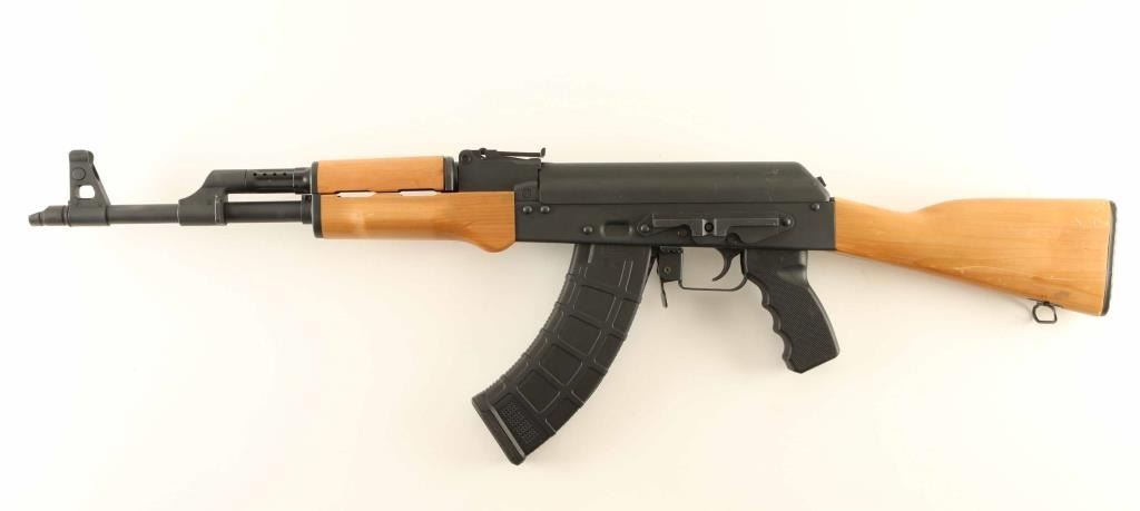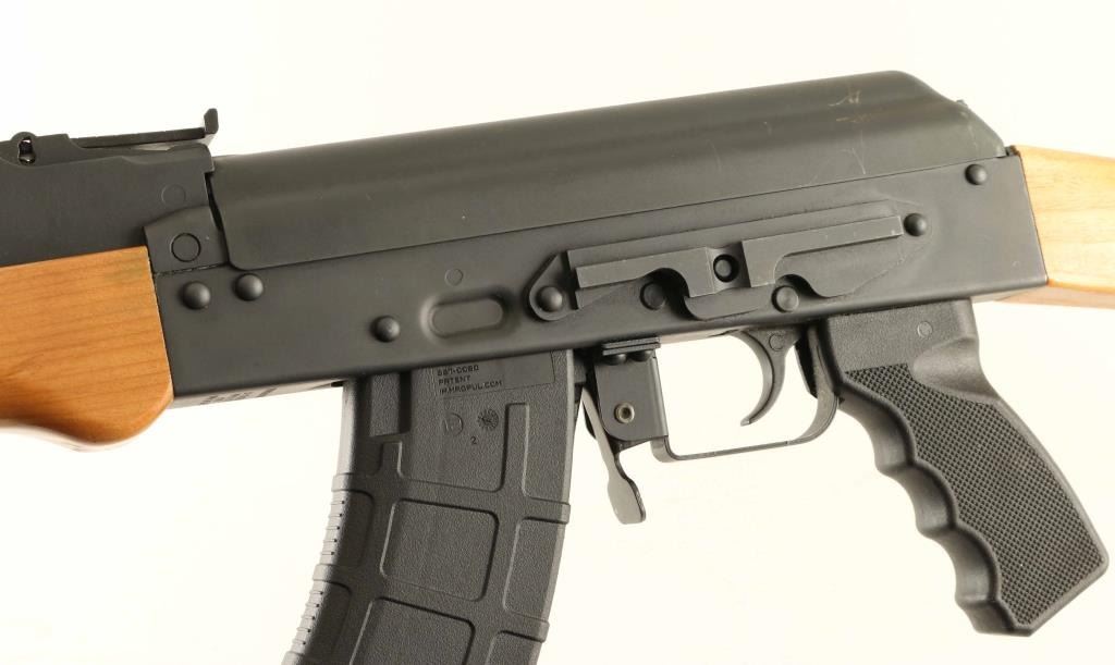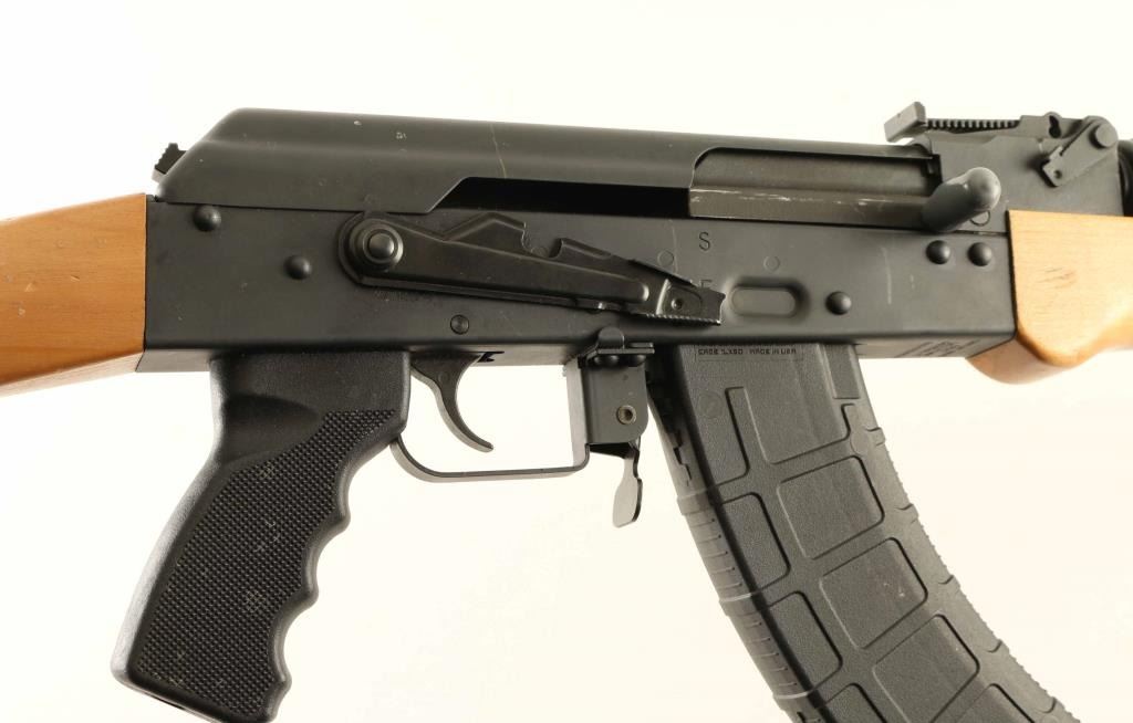 Rifle. Semi-Automatic. 30+1 capacity. American made RAS47 carbine. (Red Army Standard) , Matte-black metal finish. Blond wood straight stock, with ventilated forearm, and handguard. Steel butt plate. Black polymer, checkered pistol grip. 16.5" barrel, with adjustable front post. and leaf rear sights. AK style safety lever on left receiver. 37.25" overall. 7.5 Lbs (Empty). Bore appears excellent/bright. Action is smooth/tight. Wood is good, with minor scratches/dings. mostly on the rear stock. Metal finish is about 96%, with some scratches/rubs. Comes with one, MOE, polymer 30-rd magazine. NRA Condition-Very Good, Plus. Modern Firearm.