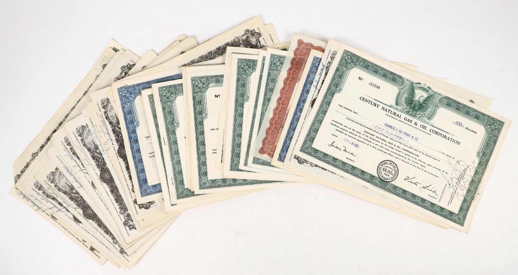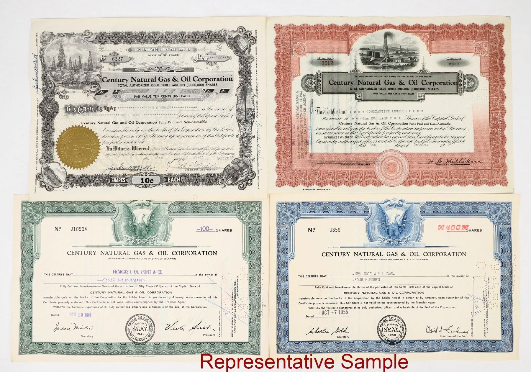 40+. I/U, I/C. Issued 1952-61. Fine ore better. Century Natural Gas & Oil Corp. Stocks, three varieties, Goes and Security-Columbian printer.