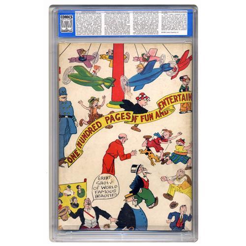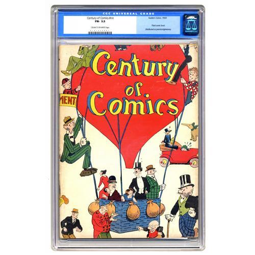 <B>Century of Comics #1 (Eastern Color, 1933) CGC FN- 5.5 Cream to off-white pages.</B></I> Just the third comic book ever made, this one came out after <B>Funnies On Parade</B></I> and <B>Famous Funnies: A Carnival of Comics</B></I>, but is much more valuable than either of its two predecessors. It's ranked among the 50 most valuable Golden Age comics by Overstreet, and would undoubtedly rank higher if not for the fact that no value above VF is listed! As far as we know, no VF copy even exists -- our offering here is topped by only one other (a 7.0) in CGC's current census. We've seen that 7.0 copy, and not to be too harsh on a 70-year-old book, but it had some "crunched" corners and lacked the brighter whites that this more strictly graded copy has. This comic's significance certainly makes it one to pursue: after the success of the previous comics mentioned above, companies such as Kinney Shoe Stores and Wheatena cereal asked M. C. Gaines, the "father of the American comic book," for another promotional giveaway item. This one certainly topped its predecessors in terms of content: while the preceding two were 32-pagers, this became the first 100-page comic book! The content consists of favorites from the Sunday funnies like Mutt and Jeff and Joe Palooka. Overstreet 2006 FN 6.0 value = $11,000. CGC census 3/06: 1 in 5.5, 1 higher.