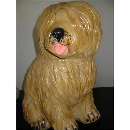 this tall and handsome dog is made of fine ceramic. has a funny and happy face and personality with chocolaty cream color. 17 " T. , 11" W. it is vintage and decorative. great collector addition.excellent condition. something to think about!