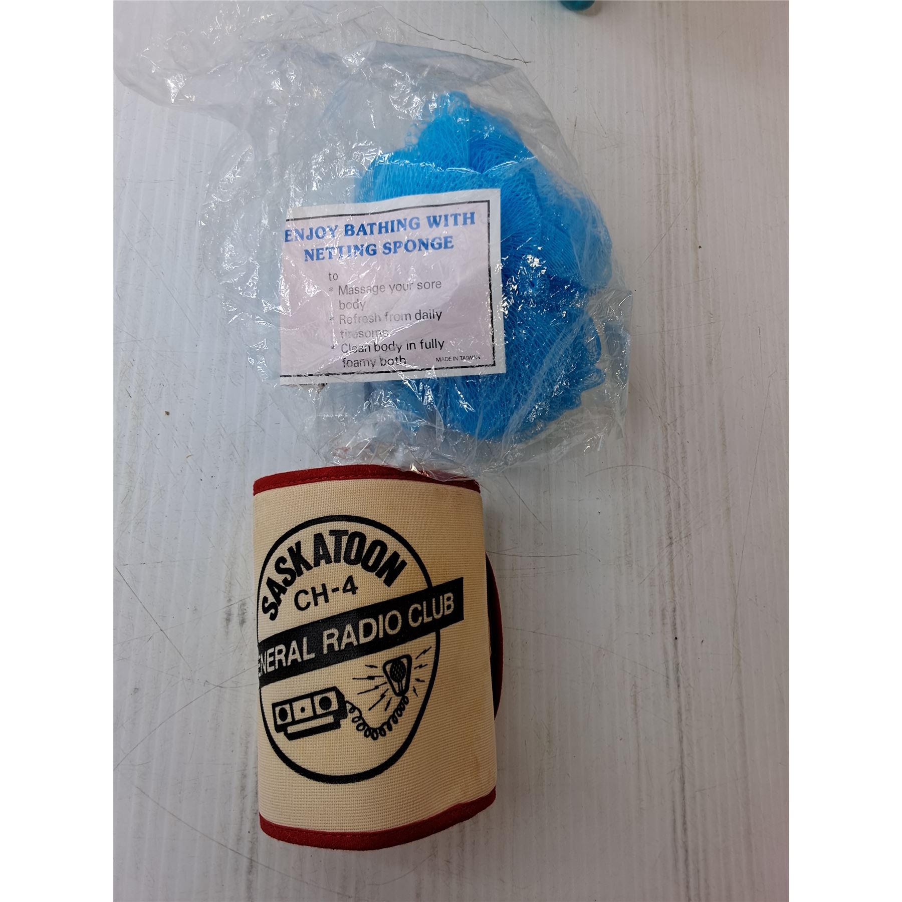 Ceramic Basinette Figurine 10" x 11", Bath Sponge, Saskatoon Radio Club Armband