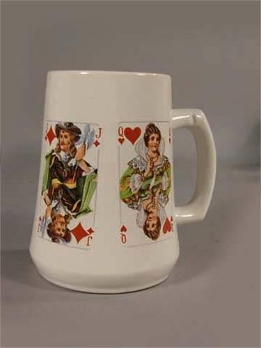Ceramic beer mug with playing card transfers, late 60's, 6" tall, unknown manufacturer, no chips or cracks.