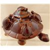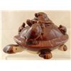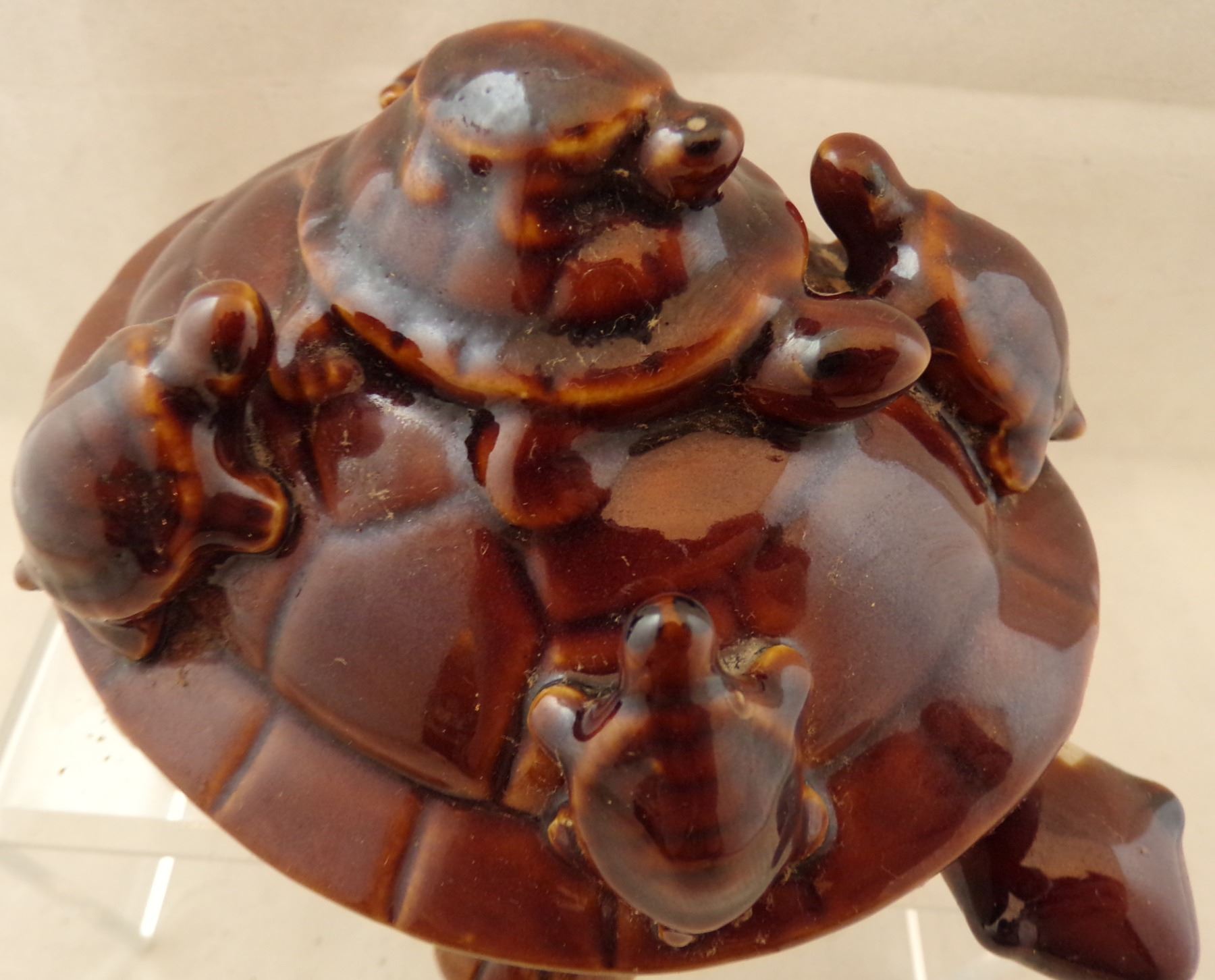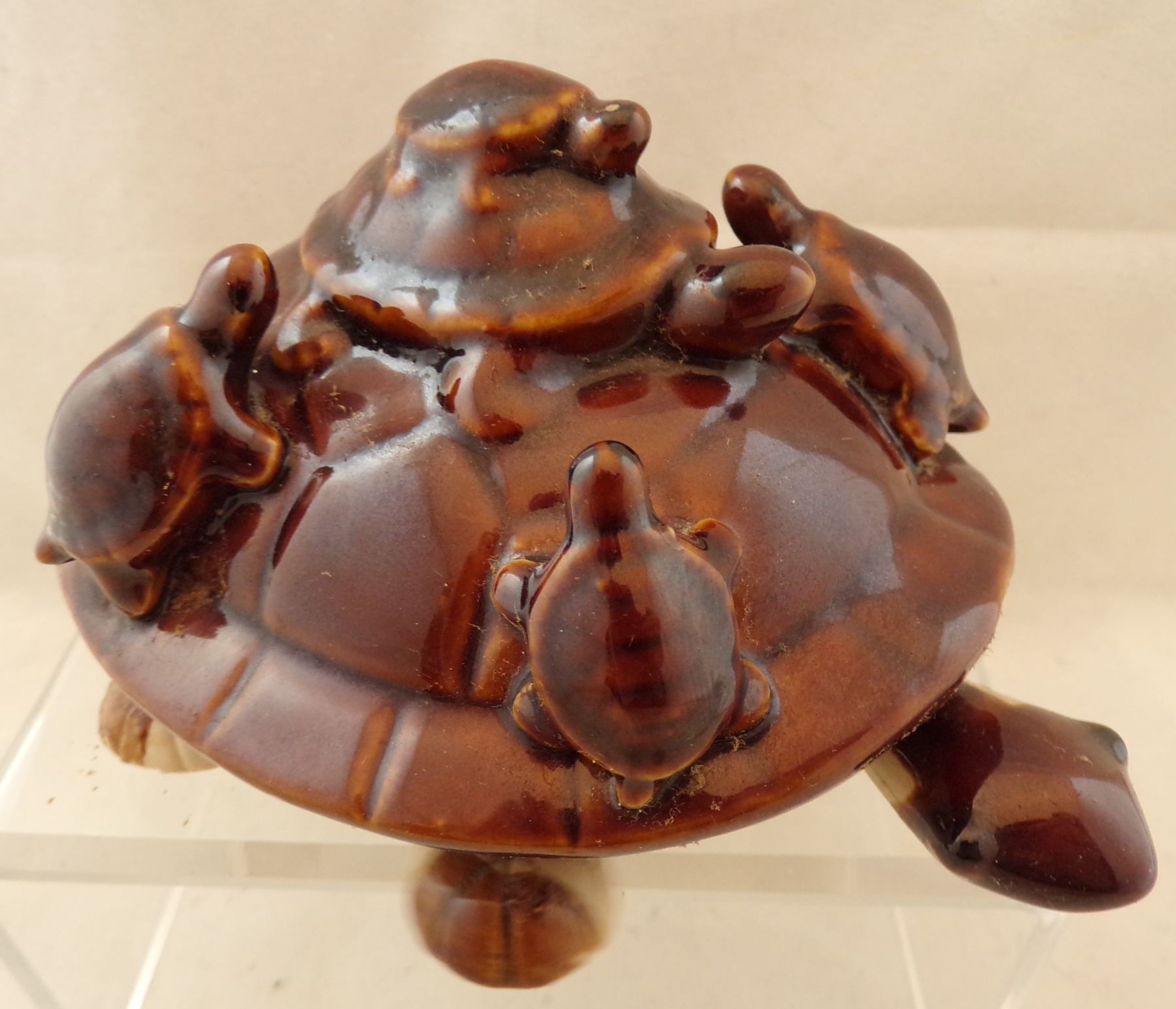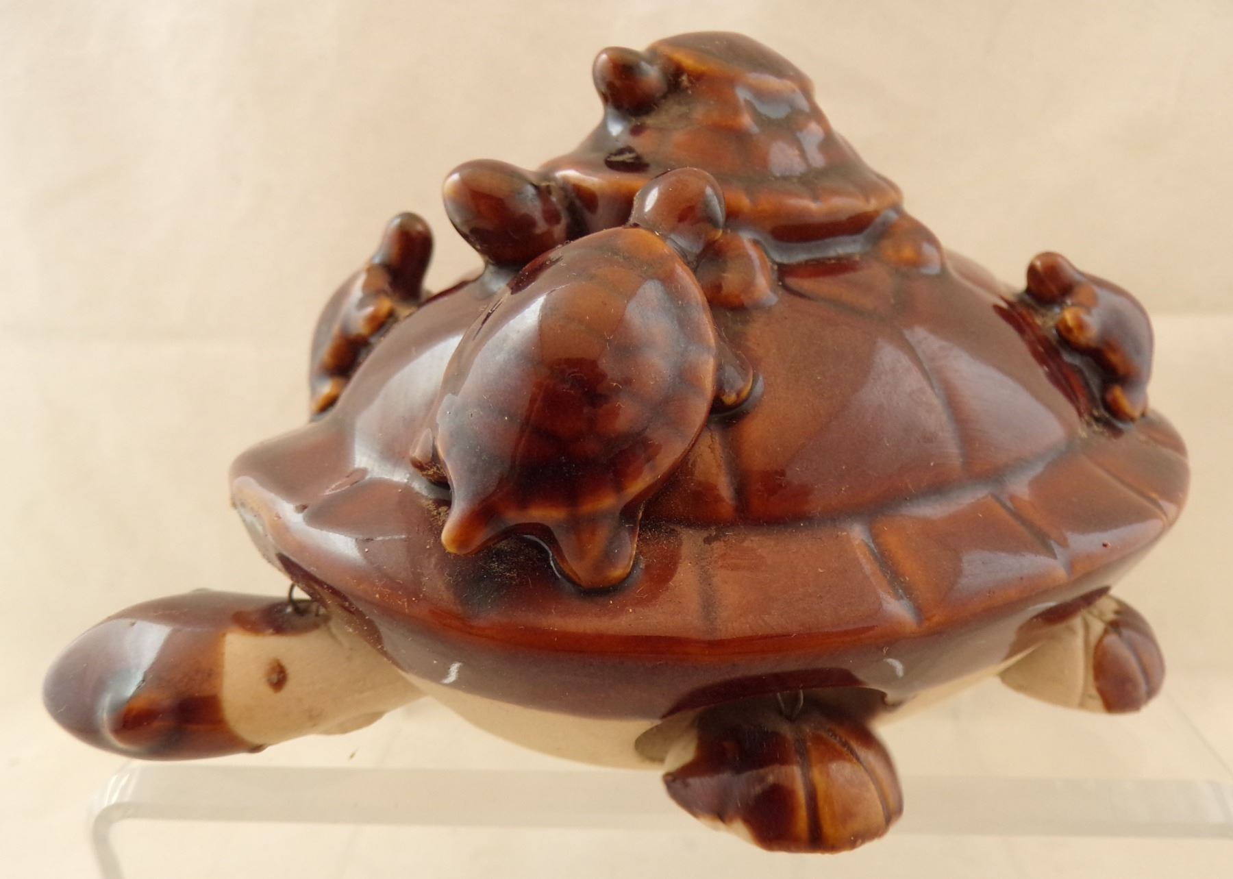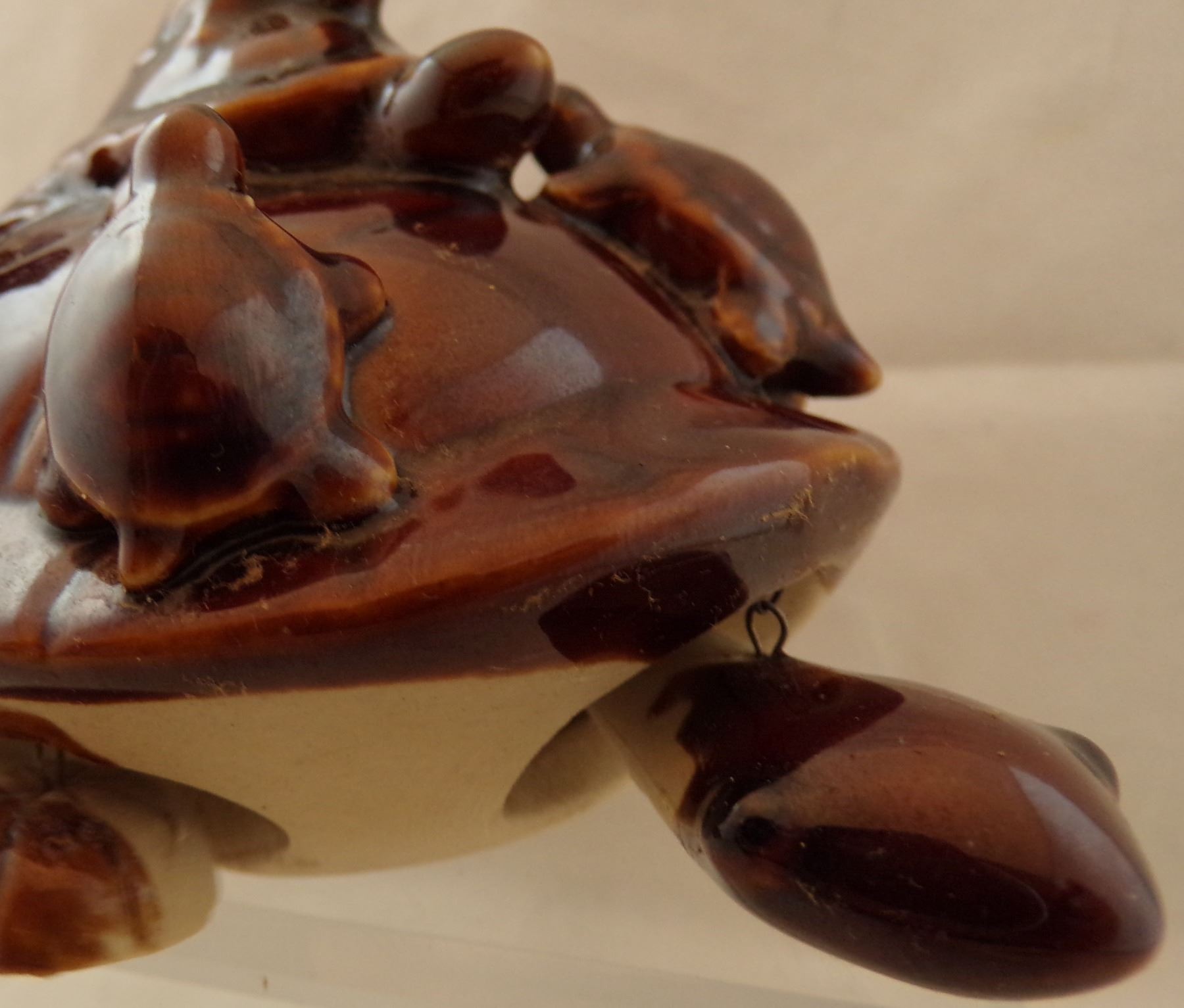 Ceramic Bobble Head Turtle, nodding, articulated, baby turtles on mother's back, chinese symbol of good luck and prosperity, measures 6.5'' x 4'', brown glazed, Sweet!