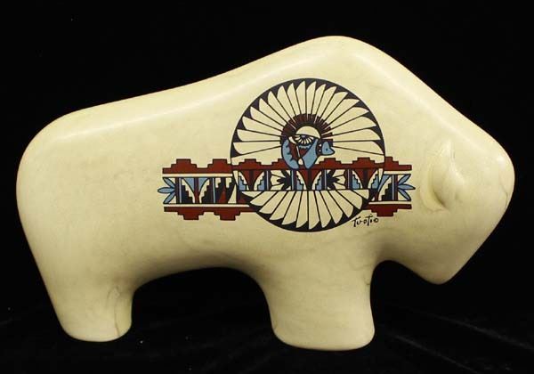 Ceramic Buffalo with Design by Tu-oti, measures 11.5'' x 7.5'' x 2''