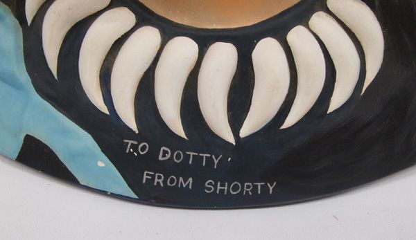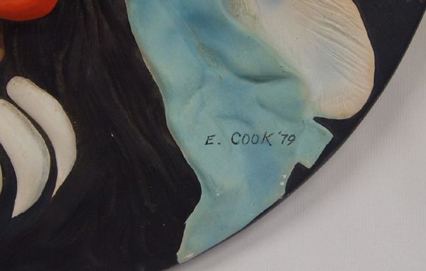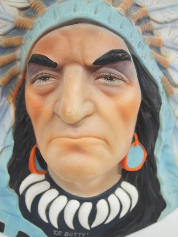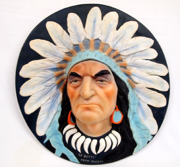 Ceramic Chalk Indian Chief Face Wall Hanging. by E. Cook 1979, and printed on the bottom, TO DOTTY FROM SHORTY which could be painted over. Hole on back for hanging. Approx 17'' diameter.