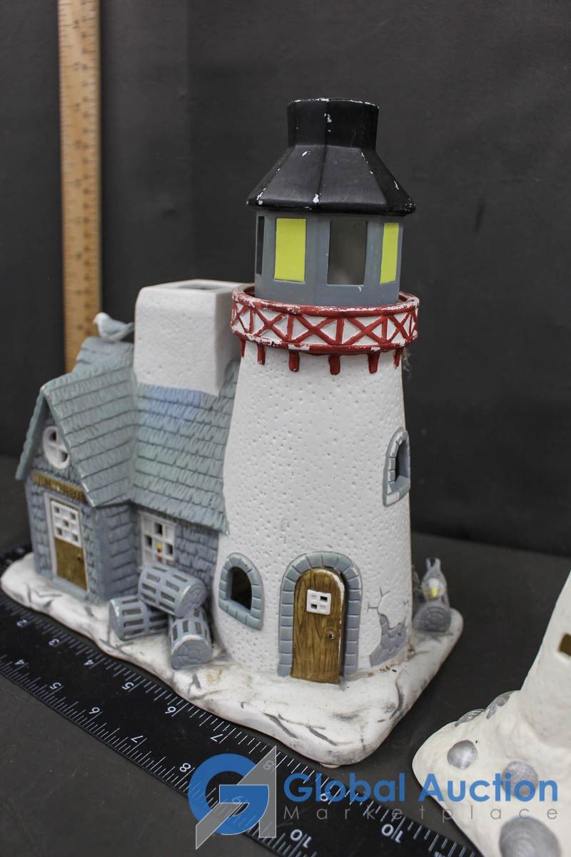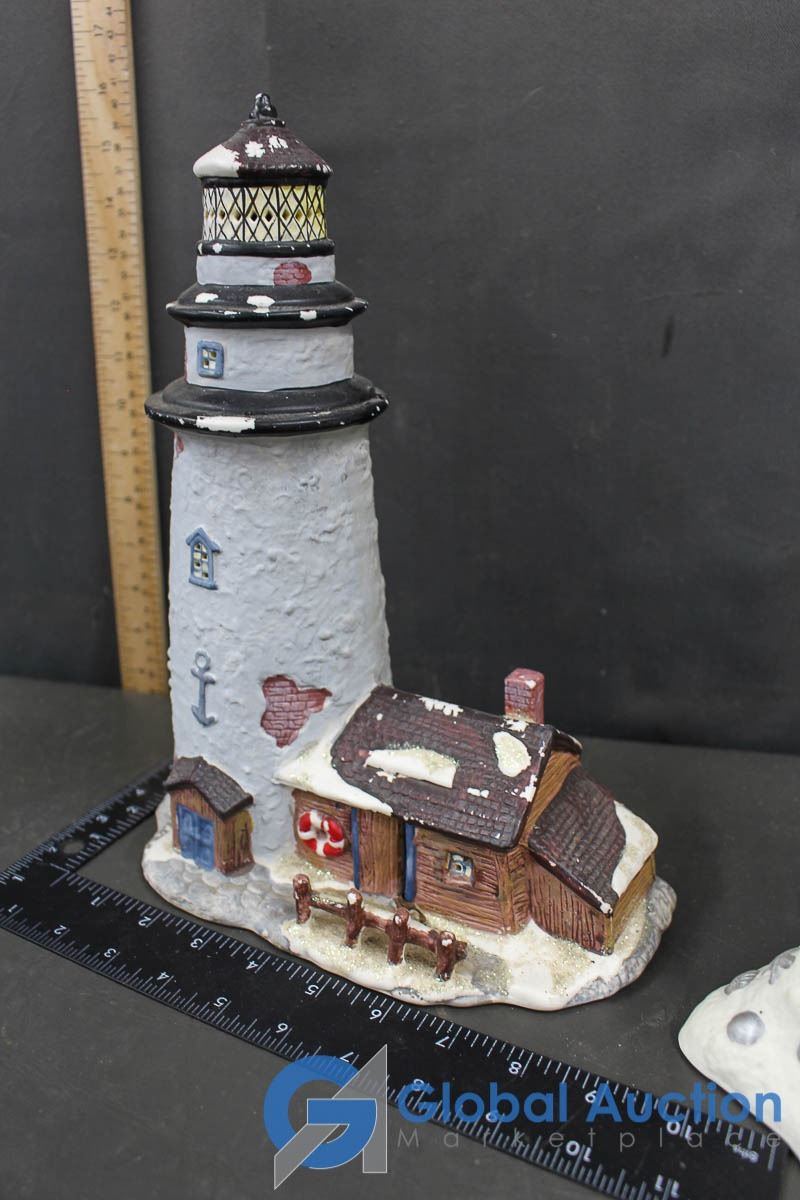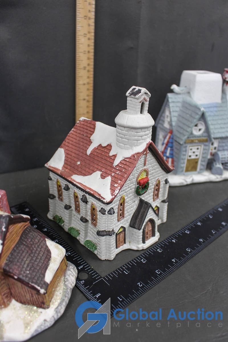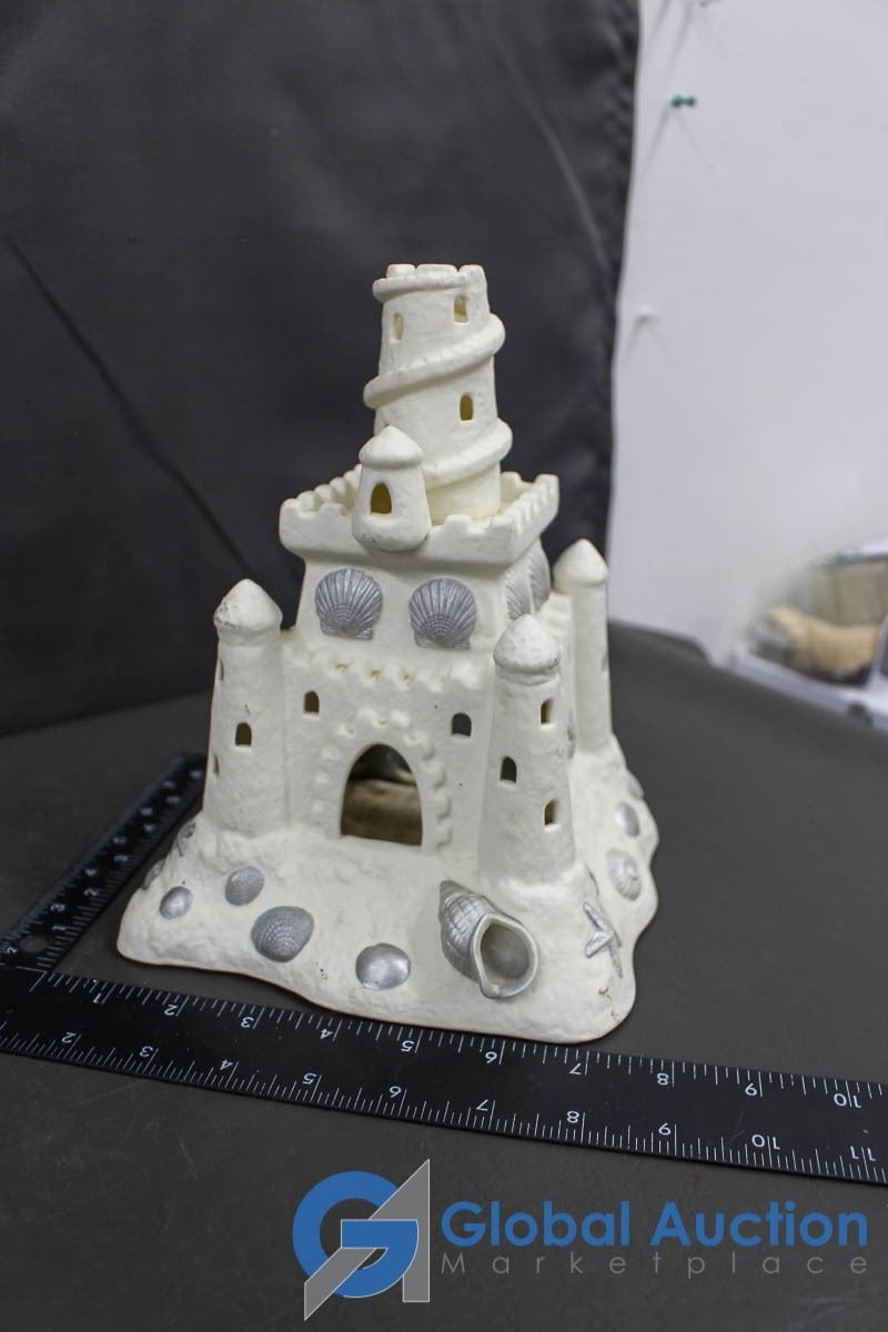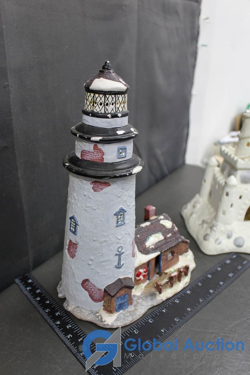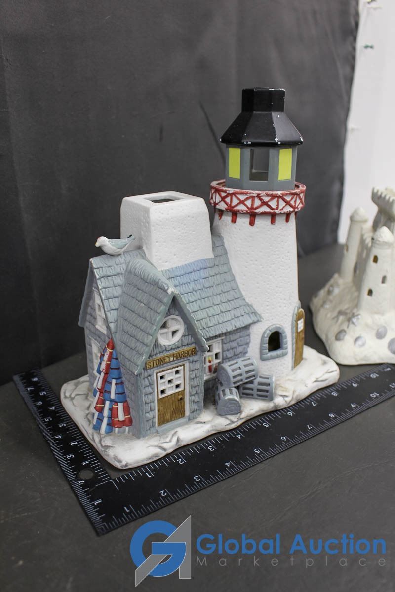 Ceramic Christmas Village Ornaments and Sand Castle