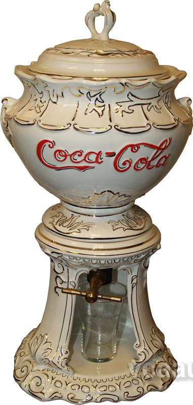 Ceramic Coca Cola 3-Piece Urn Liquid Dispenser made by Markatron Inc. Atlanta, Georgia c1970 w/ small flared etched Coca Cola drinking glass