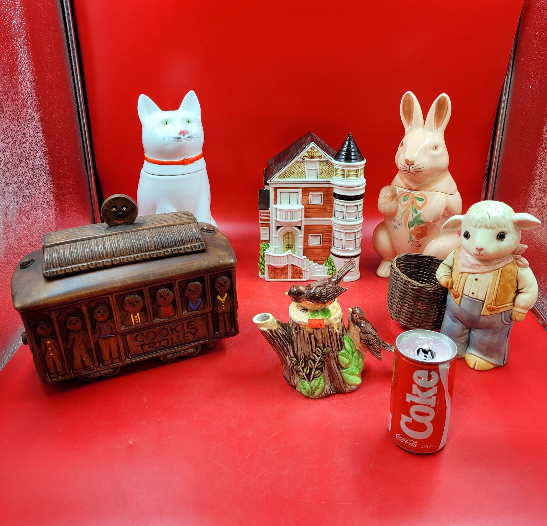 Ceramic Cookie Jars, Teapot, & Treasure Craft Cookie Trolley Made in USA