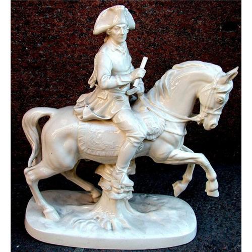 Ceramic figurine of the Der alte Fritz ( The old Fritz ) or Friedrich der Zweite-King of Prussia or Friedrich der Grosse , means " Friedrich the Great " , in very good conditions, really cannot find any defect , it is an important piece , measuring 15 inches H and 16 inches wide ( 38 cm H and 40,5 cmt W) , cannot find the Mark at my Kovels Guide, this is obviously a German piece , but does not state country or factory at the Mark, so we can suppose it is at least made before 1810. Incised is also a number 6.