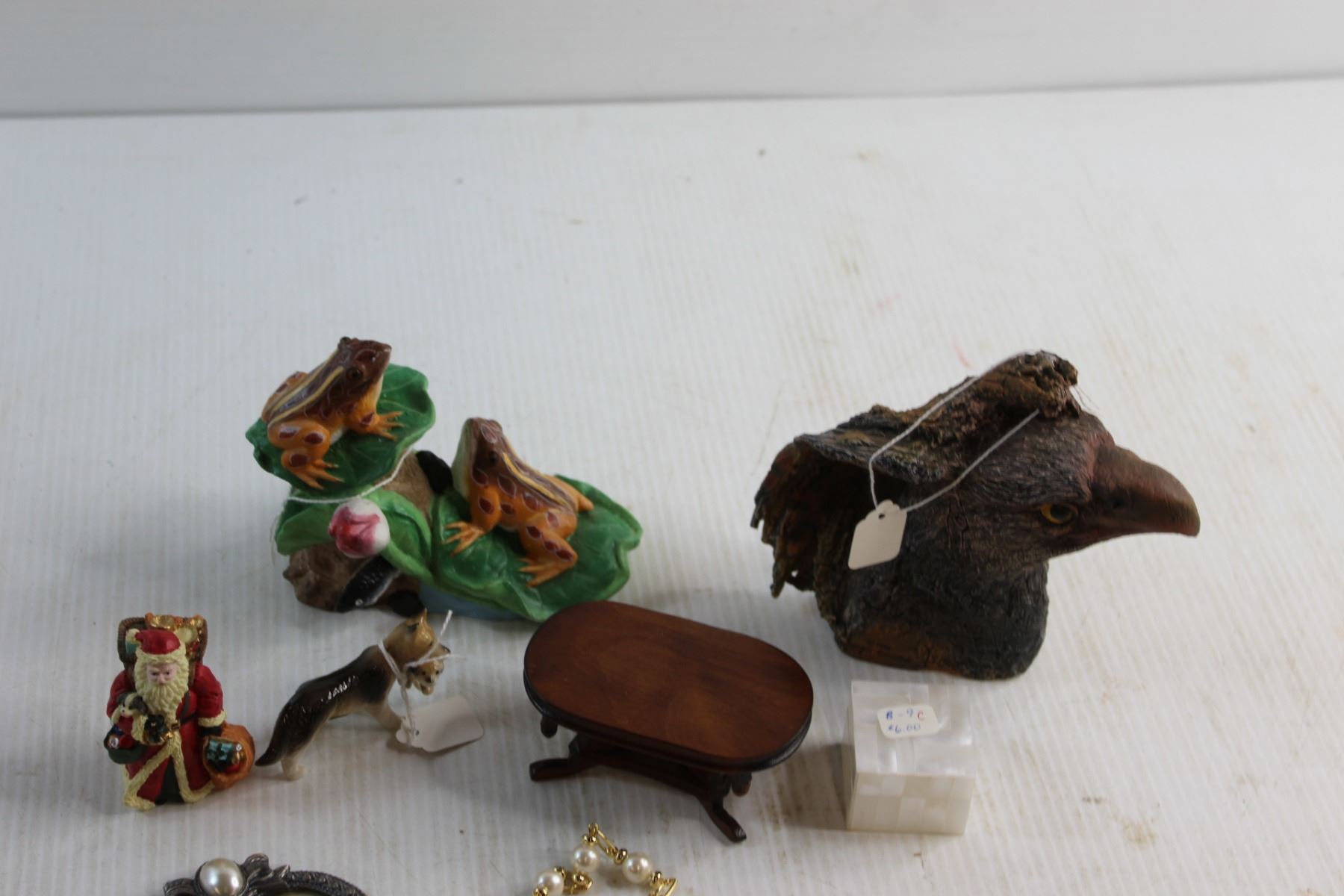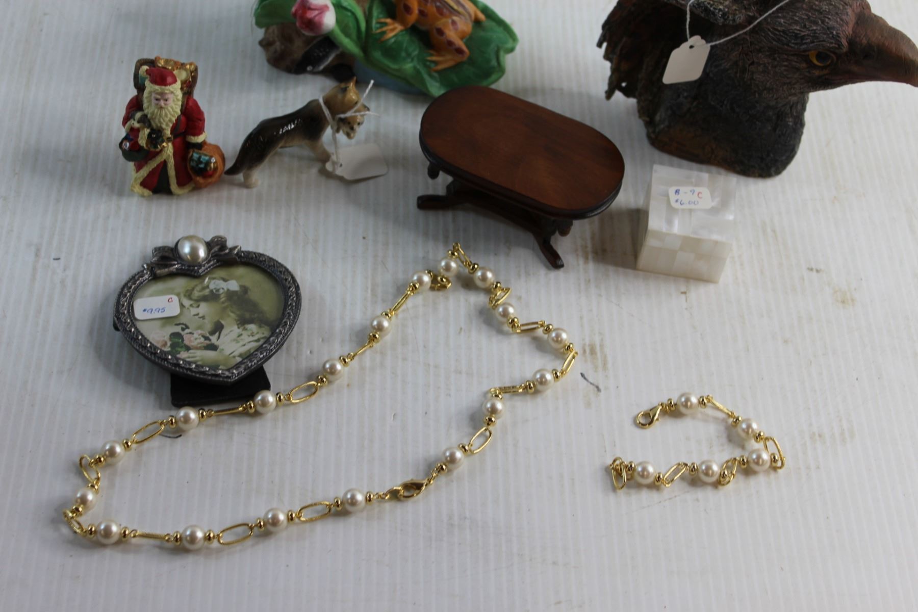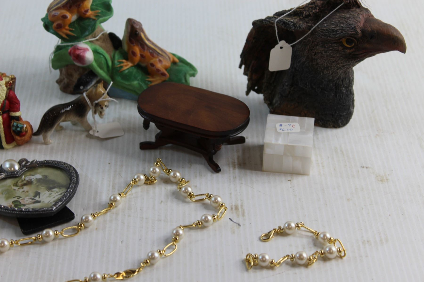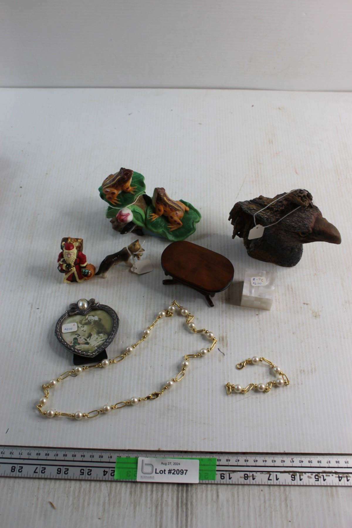 Ceramic Frogs, Eagle Head, Santa, Bracelet and Necklace Set and Assorted Items