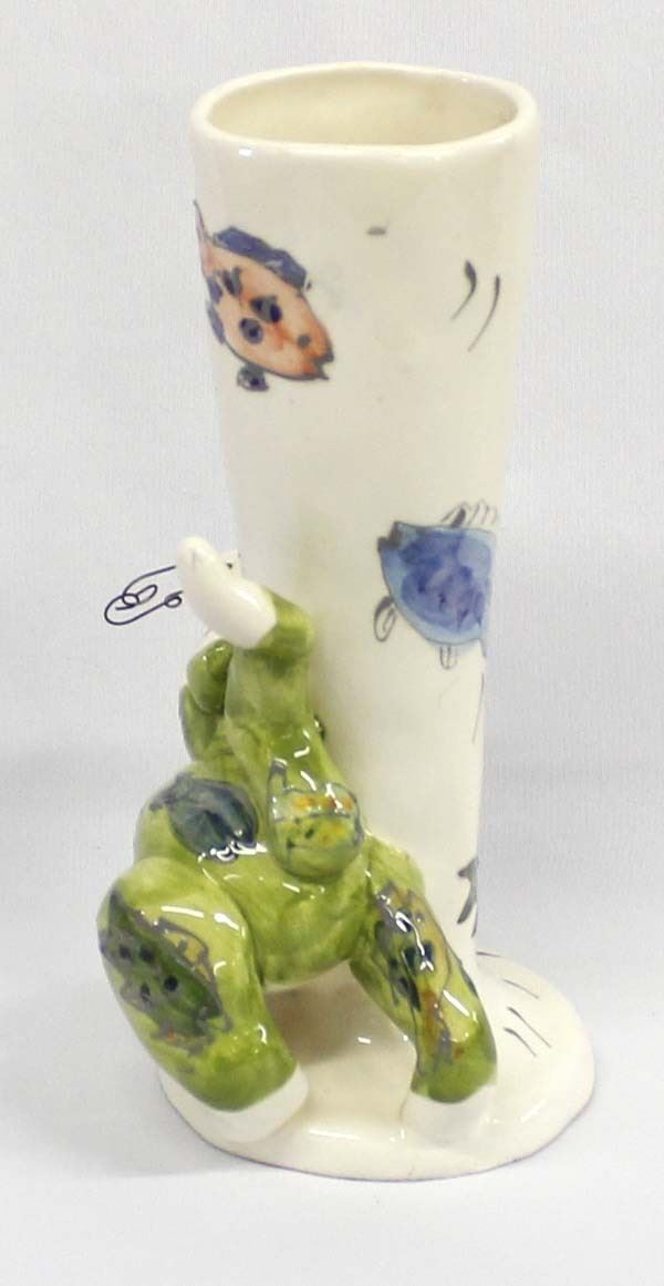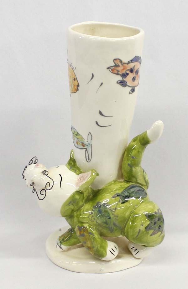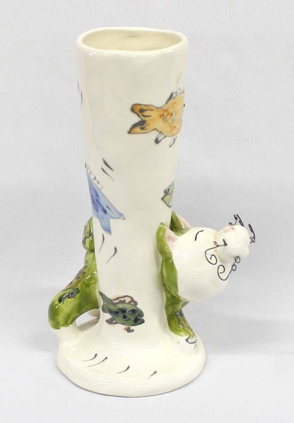 Ceramic Hand Painted Kitty Cat Vase, measures 6'' x 9.5'', curled wire whiskers, swimming fish on vase, Sweet!