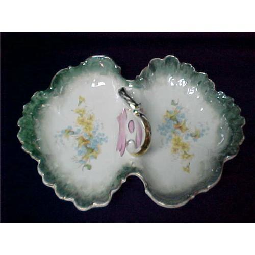 A ceramic, handled, divided serving dish. The dish is German and carries the mark (an R on the bottom) of Johann Heinrich Koch and was produced between 1805 and 1816. The dish is oblong with an irregular crenulated margin, with a long dimension of 14 inches and with each division being 10 ¼ inches wide. The center of each of the two sections of the dish has a floral pattern in yellows and blues against a white background. The central ridge, which separates the sections and carries the handle, is decorated with strokes of pink bordered in gold. The handle is white with gold decoration on the top. The central bowls grade toward the margin into a green and the upper edge is bordered in gold. There is no decoration on the bottom except the letter ?R?. The gold is worn around the edges and on the top of the handle. There are a few small irregularities and pits in the glaze but they are only apparent under close examination.