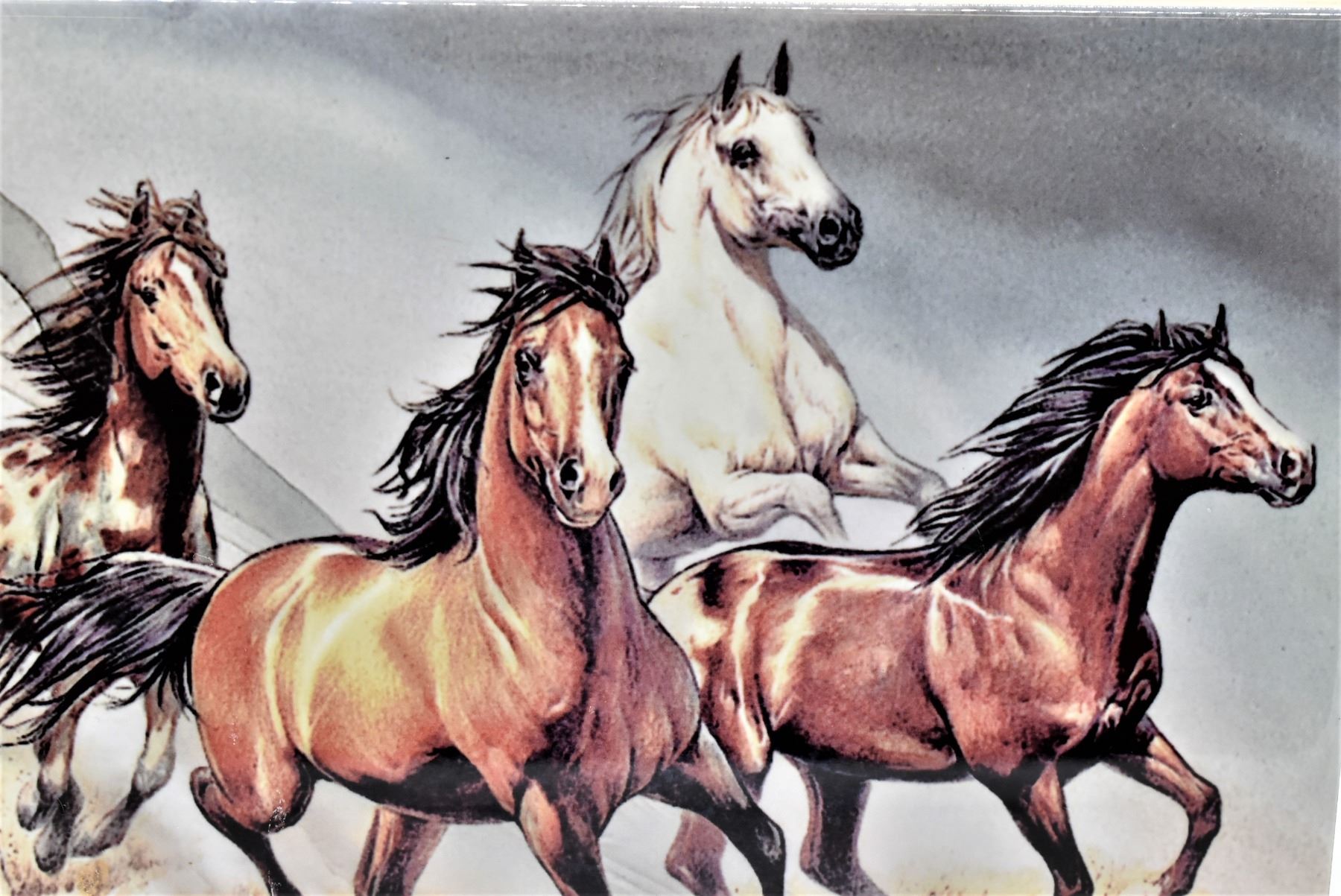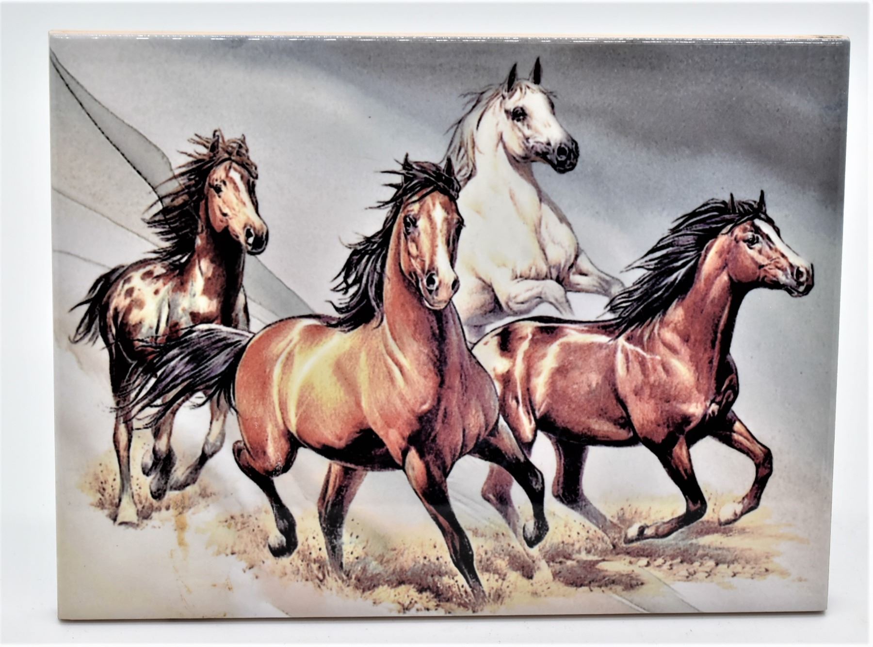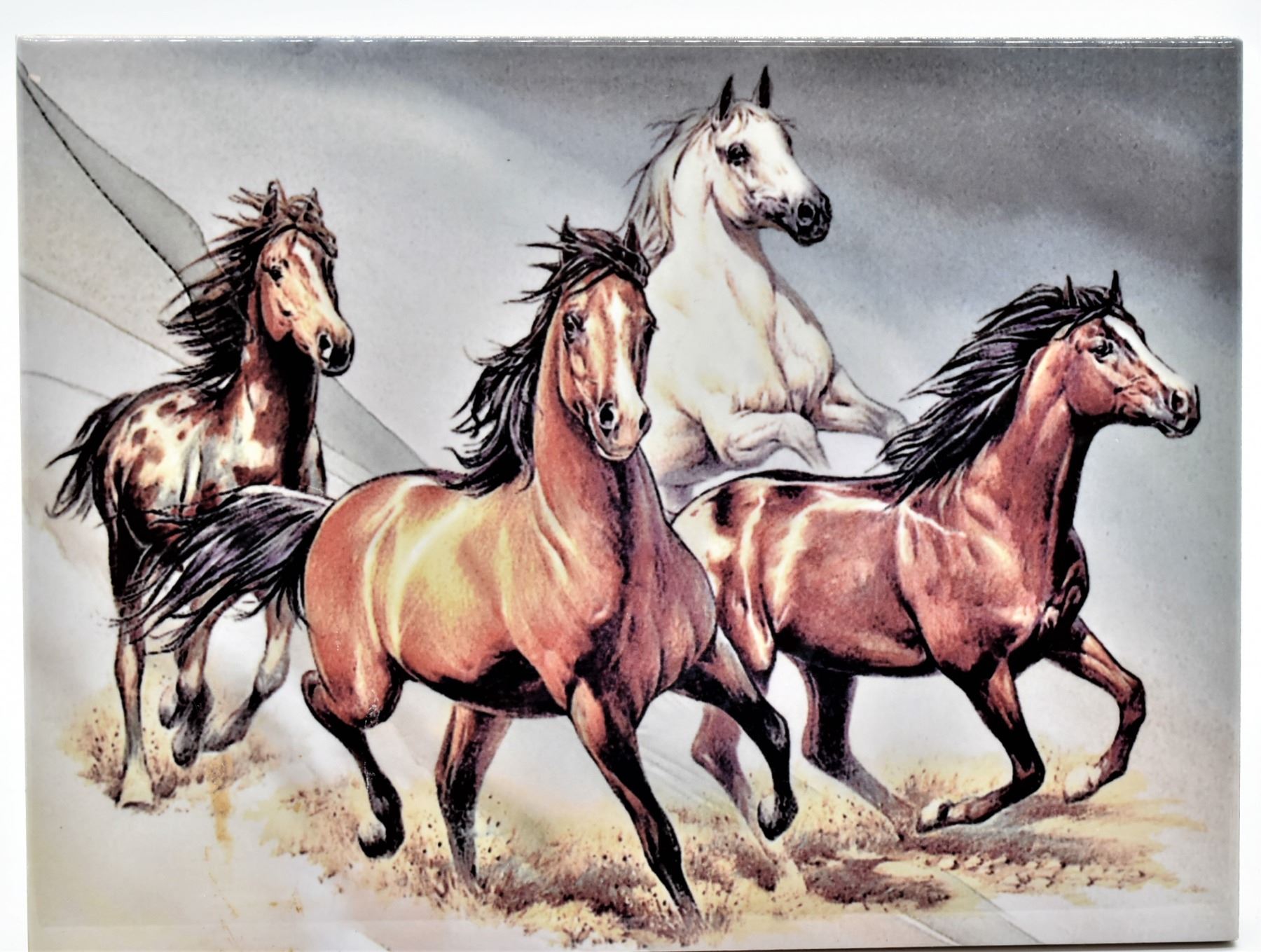 Ceramic Horse Tile, measures 6'' x 8'', a framed backing has been glued onto the back so it could be displayed like a picture, beautiful horses