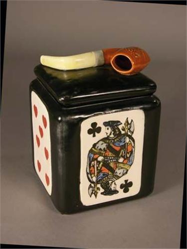 Ceramic humidor with playing card motif - pipe on lid, rare, no chips or cracks.