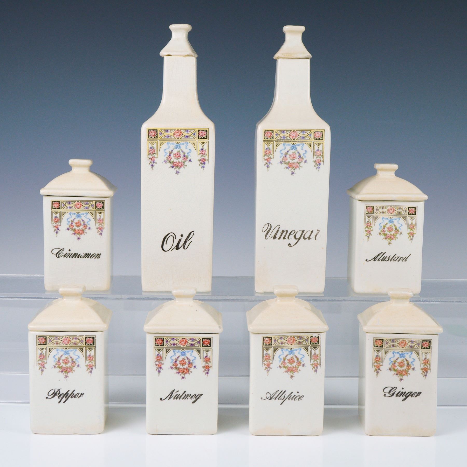 A charming and complete set of eight antique ceramic kitchen canisters, each beautifully adorned with vibrant floral transfer designs and classic black script labels. This late 19th to early 20th-century Victorian set includes two tall bottles labeled "Oil" and "Vinegar," alongside six smaller spice jars labeled "Cinnamon," "Mustard," "Pepper," "Nutmeg," "Allspice," and "Ginger." Each piece is constructed from glazed ceramic with a softly aged ivory tone, exhibiting a fine crackle glaze consistent with age. The decorative panels feature bouquets of pink roses, purple violets, and leafy garlands framed by archways and intricate scrollwork, accented with sky-blue ribbons on select jars. The labels are executed in elegant black cursive lettering that contrasts beautifully with the warm cream background. Larger containers measure 2.5"L x 2.5"W x 9"H. Smaller containers measure 2.5"L x 2.5"W x 5"H.