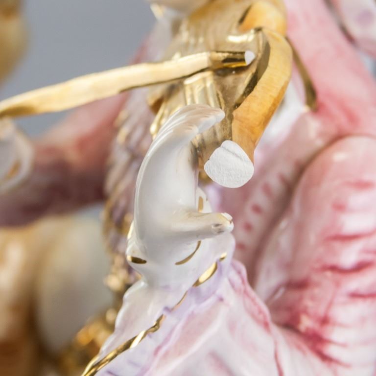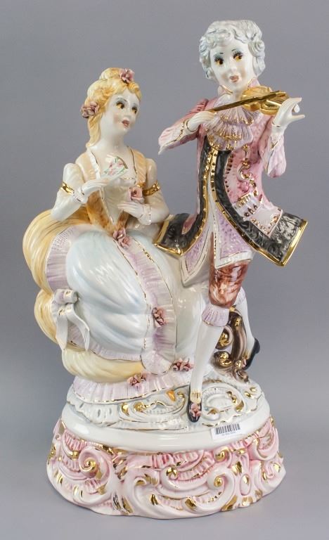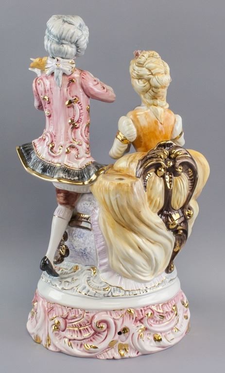 Ceramic lamp base. Featuring a man playing the violin for a woman. Figures dressed in rococo style. Chip on violin. 54 x 31 cm. 3 kg..