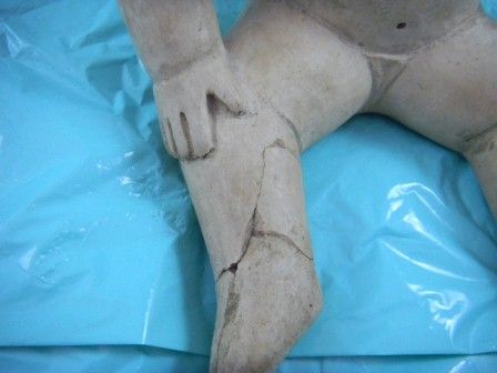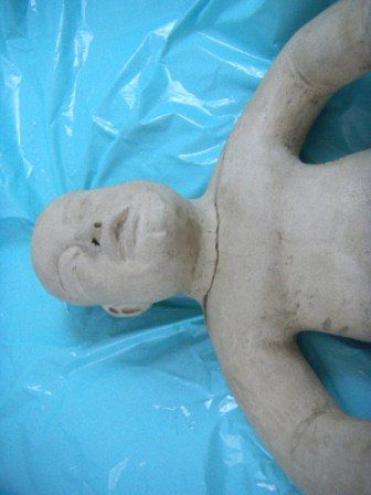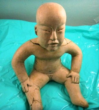 Ceramic Olmec Baby which measures 9x10 inches. The item has been broken and glued at the neck and right foot. This is believed to be pre-historic. This from Berg Collection, San Diego Shipping $20.00