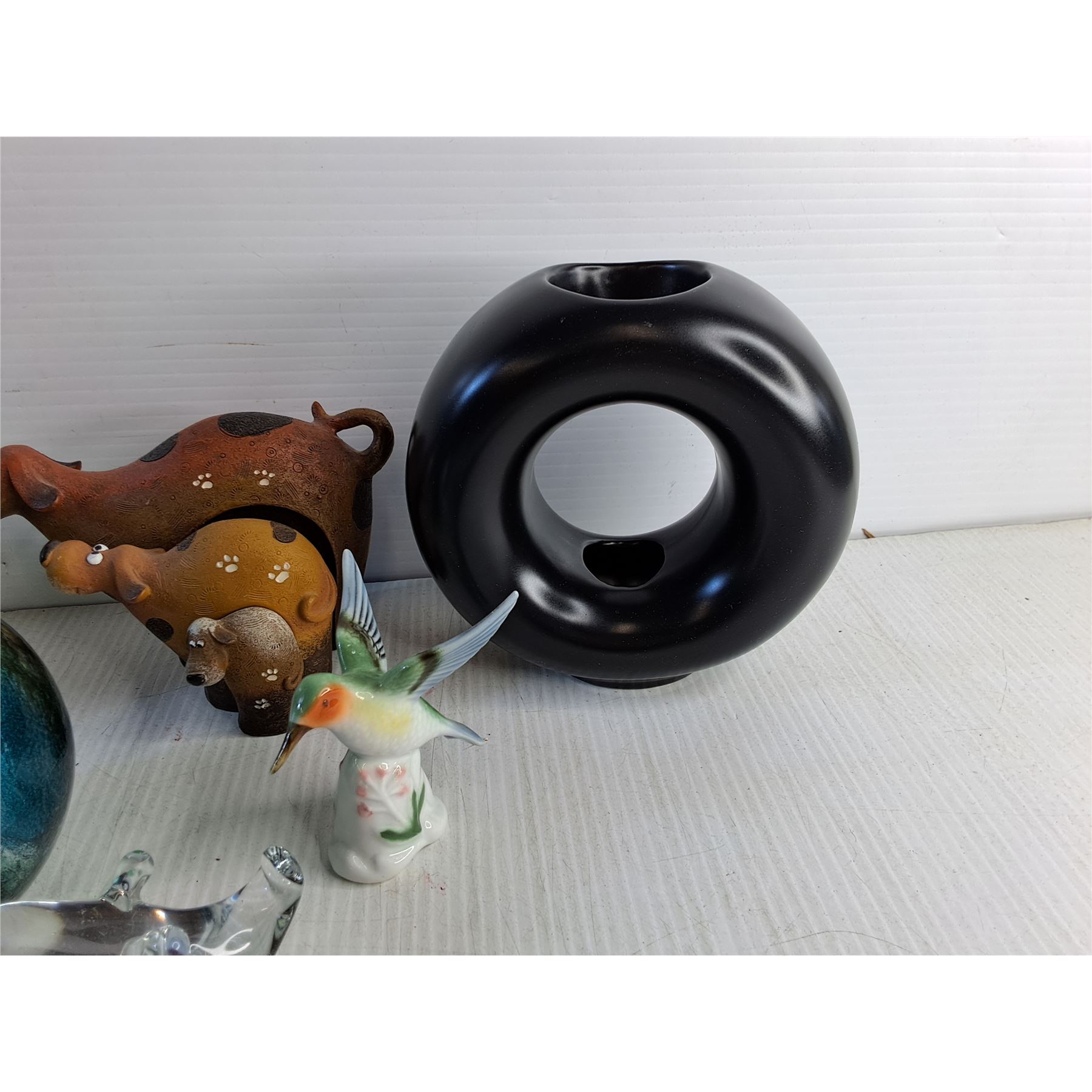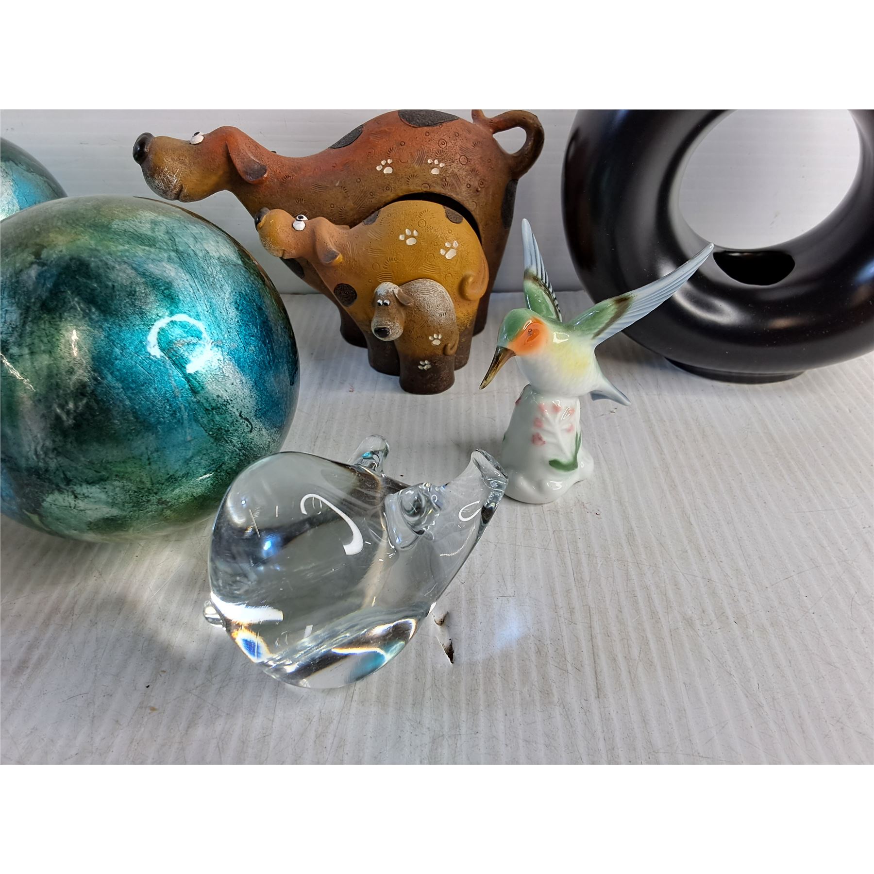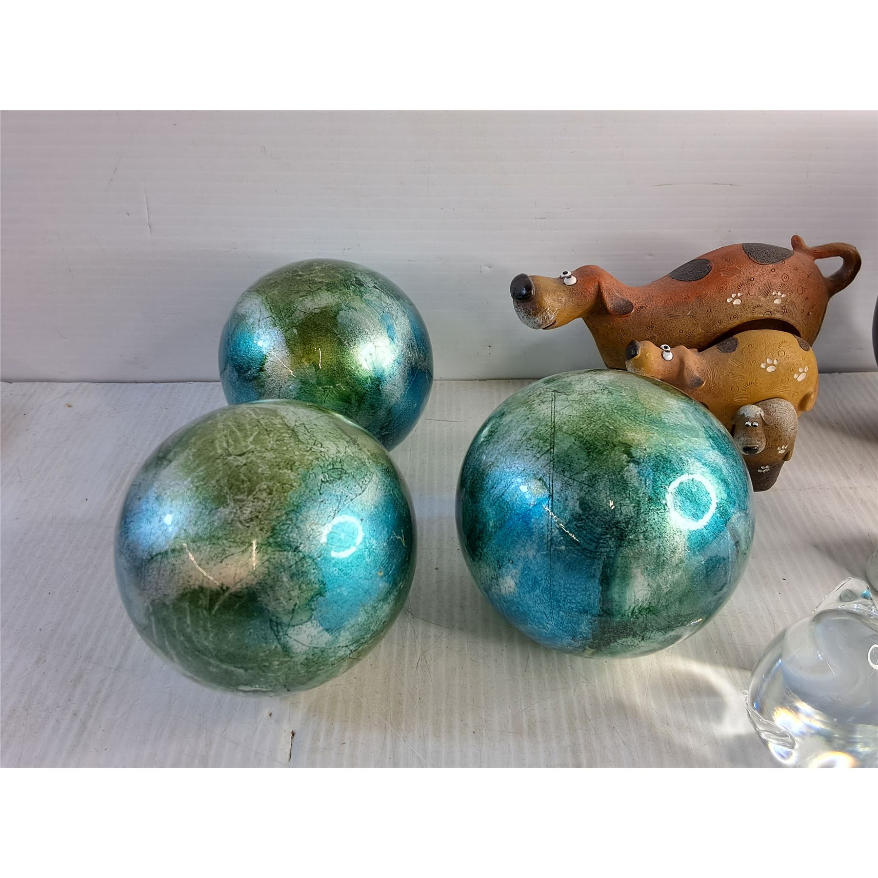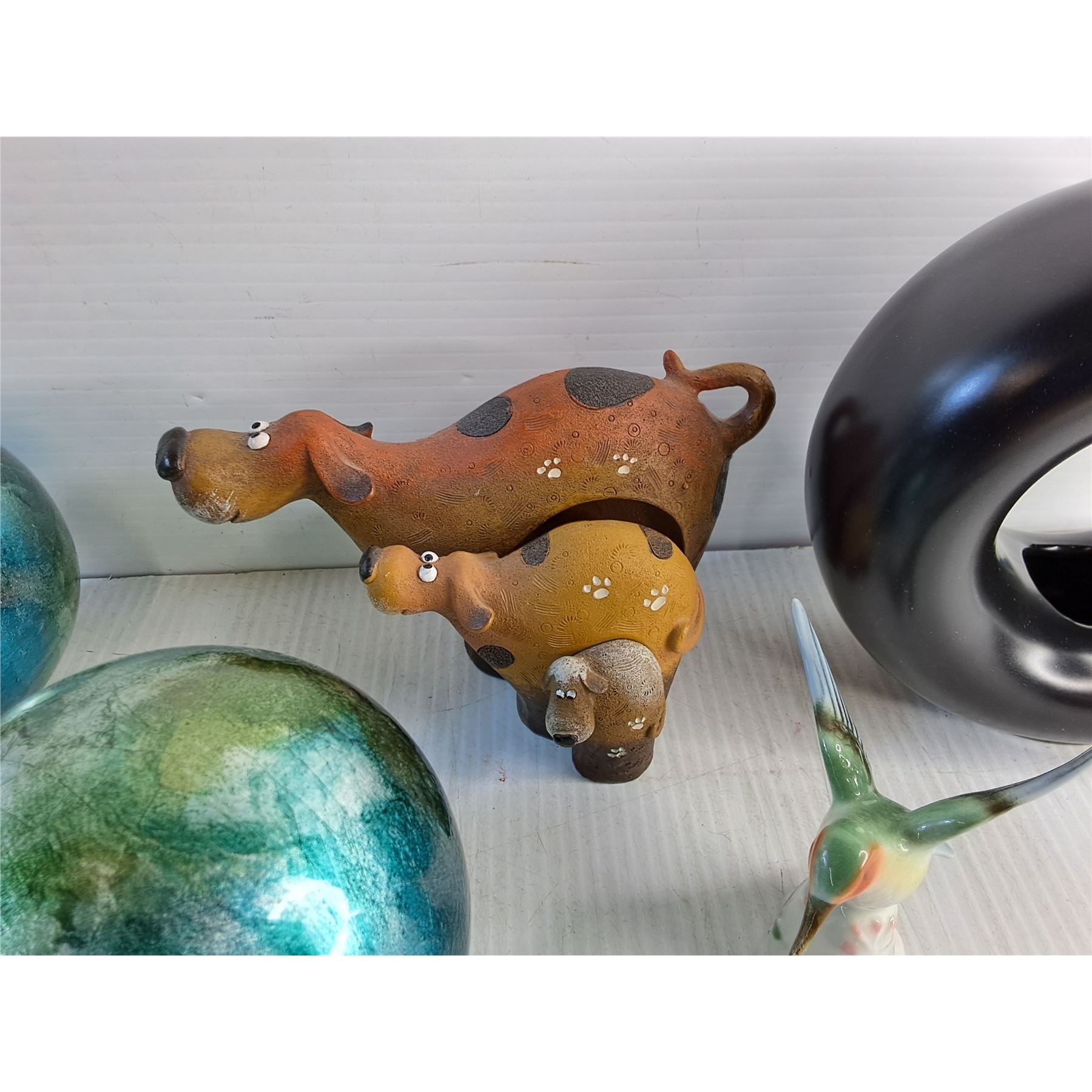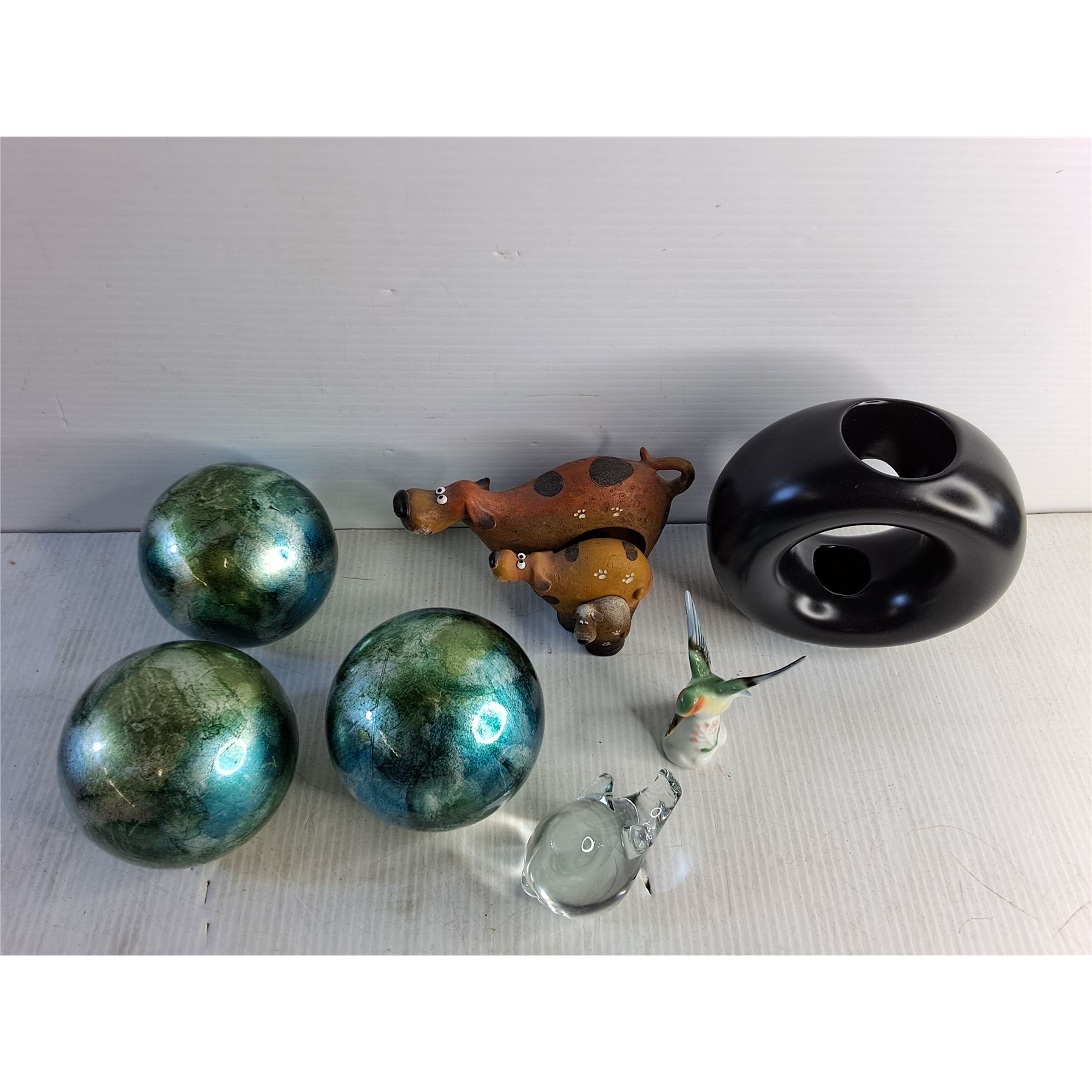 Ceramic Orbs, Candle Holder, Nesting Dogs, Glass Pig, West Germany Hummingbird, Xmas Paper