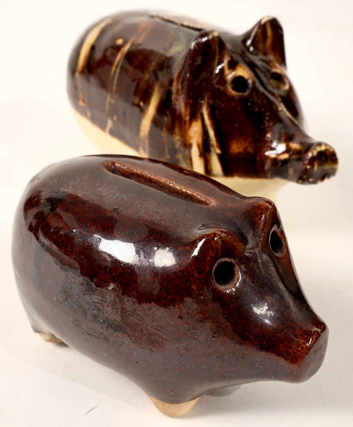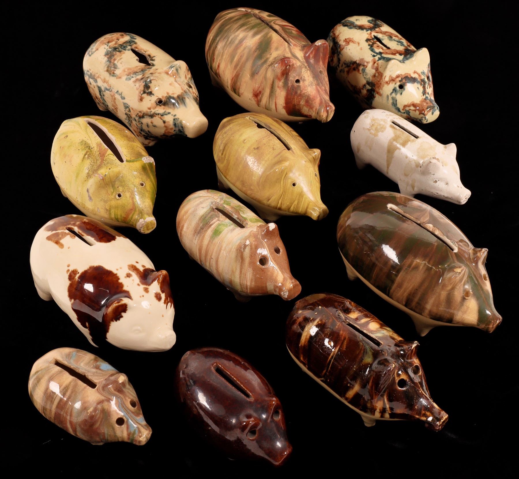 About 15 ceramic pig banks from various maker. Sizes vary, about 3x4.5". See photos.