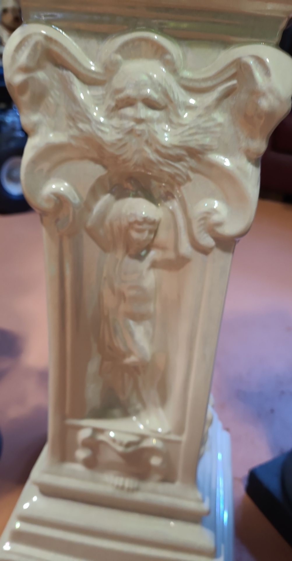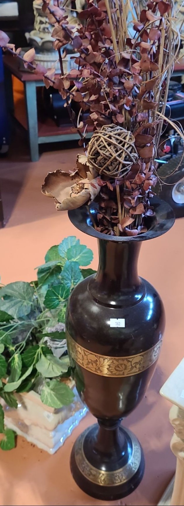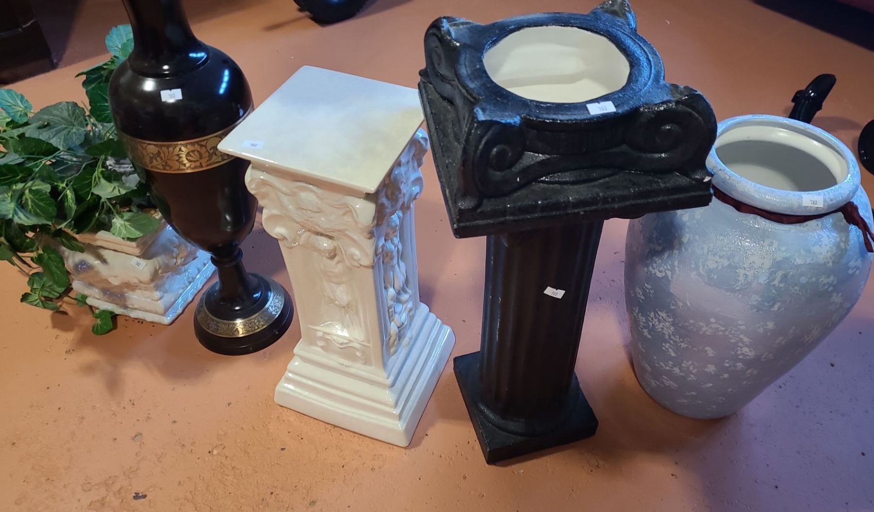 Ceramic Pillars 19 T Plus Base/ Pot, Brown Vase 25 T, Also Includes Blue Vase and Plants