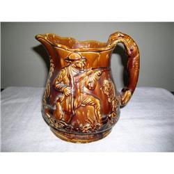 This Ceramic Pitcher dispalys a Hunter and His Dog on one Side. And Tress and Birds on another side. The Mottled Brown Glaze is known as Rockingham, first developed in England around 1825. At least 70 potteries in New England and the Midwest produced similar pieces from the mid-1800's until early in the 1900's. Insurance value for the pitcher is $700.