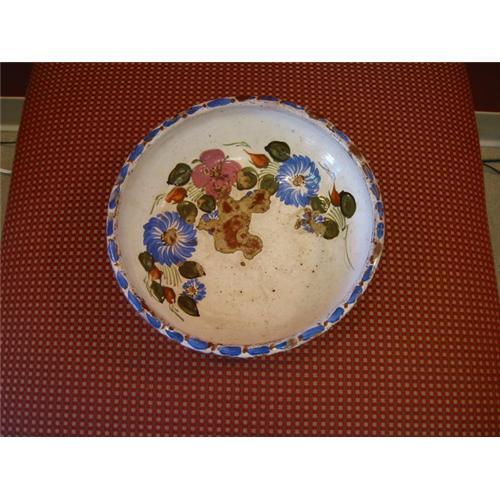 Very old polychrome bowl. c. 1860 in very good condition allthought there is general wear but mostly the glaze is intact. The colors of the flowers are strong and brilliant. The entire bowl is lined with blue leaves.