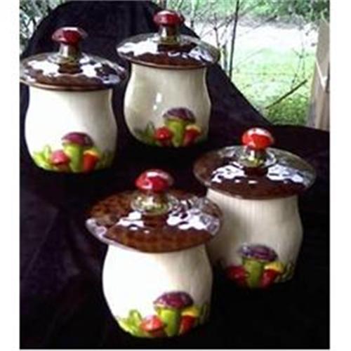 Set of four ceramic canisters. They have 3-D mushroom decorations molded into the shape. The canisters look like mushrooms with the lids looking like the tops. The knobs on the lids are also mushrooms. The only mark I can find is inside one of the lids and it states:500 USA. They range in size from aprox. 8 1/4" high and 6" wide for the largest to aprox. 7"X5" for the smallest one. They are in very good condition. The only flaw I have found is a chip on the inside lip of one of the lids.