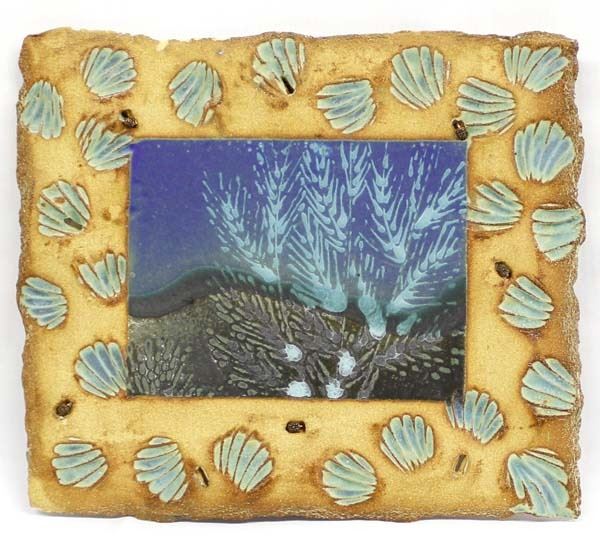 Ceramic Pottery Wall Hanging by New Mexico/Vermont Artist Polly Whitcomb, measures 12.5'' x 11'', signed on the back, Polly was born in Vermont , moved to the Southwest and then back to Vermont . She is currently producing wall art. Her pottery pieces are rather rare. For thirty years or so I have been a potter, using stoneware clays, usually thrown and altered. Often the pots are patterned using a wax-resist technique. Sometimes bits of masking tape are arranged on the pot and then removed after the glaze is applied, leaving a pattern. A range of blue and green glazes are used, which contrast with the sandy color of unglazed portions of the piece.''