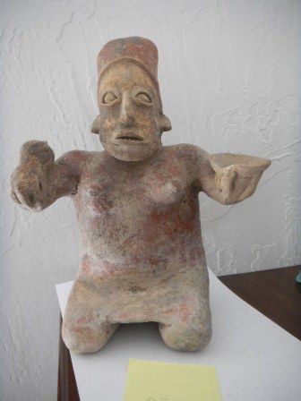 Ceramic Pre-Columbian figure from Jalisco which measures about 12x10 inches. This item has restoration on the bottom. The figure is holding a squash one one hand and bowl in the other hand. Shipping $20.00