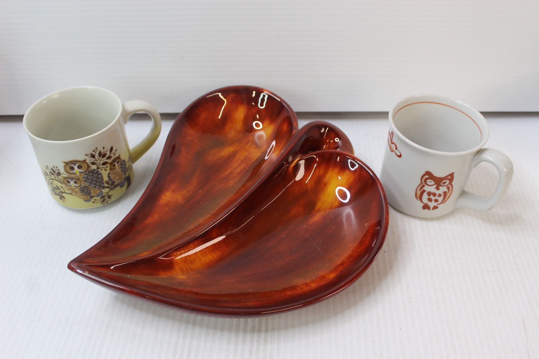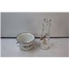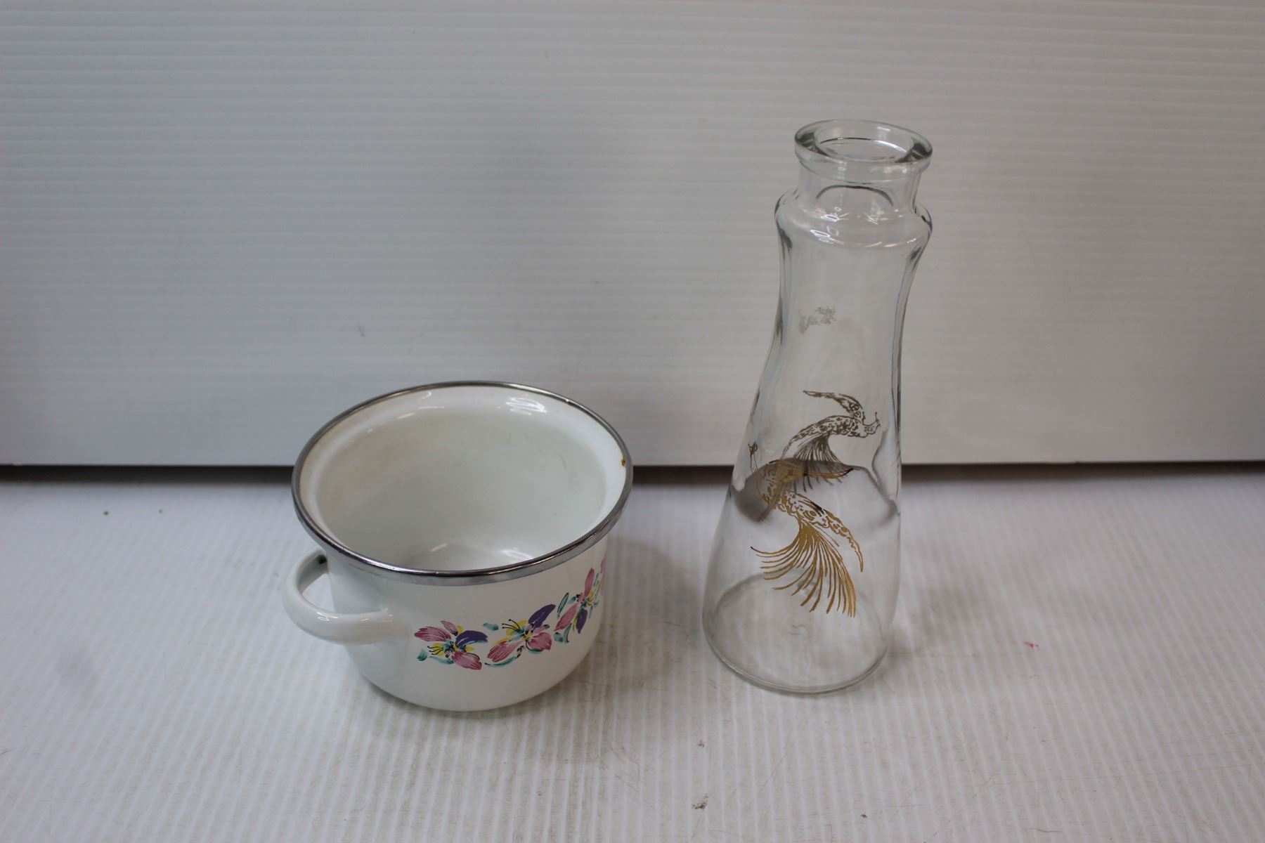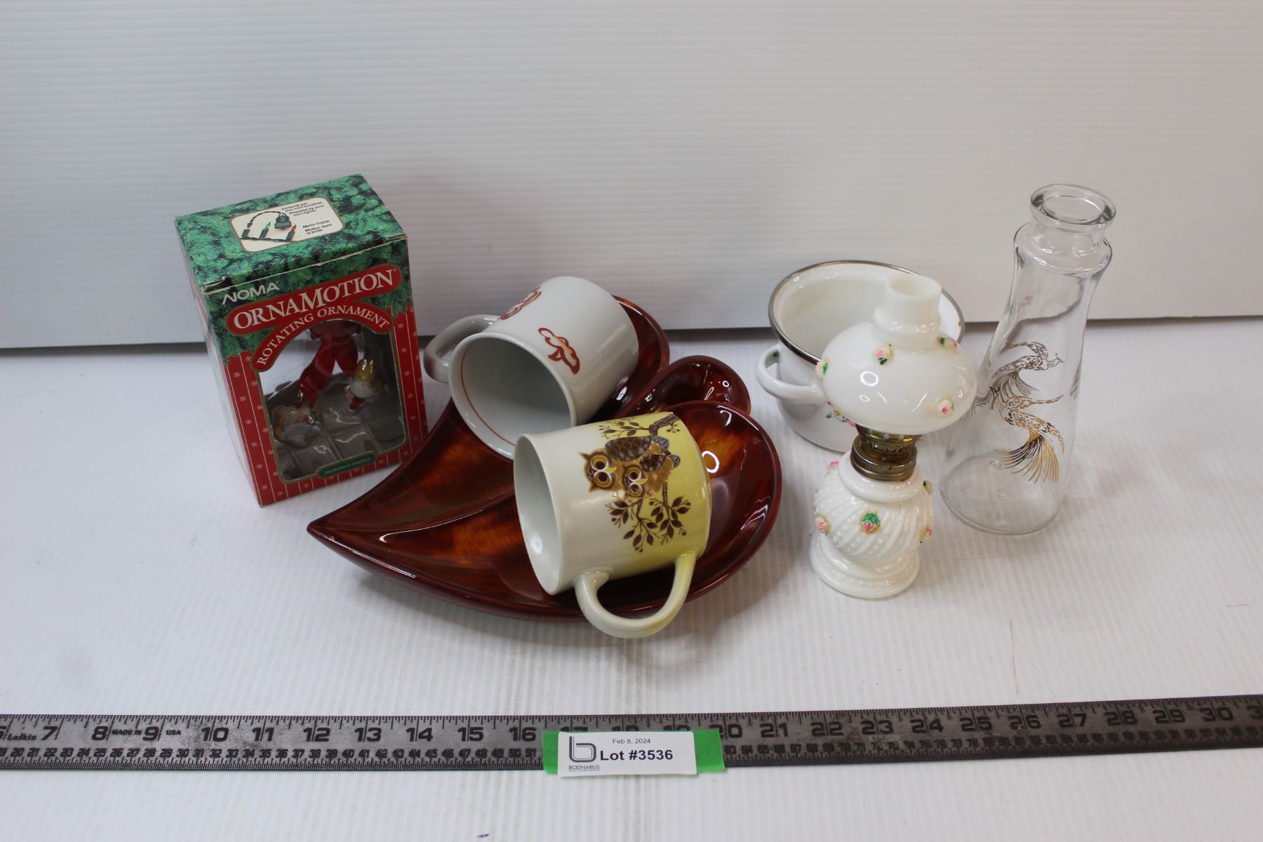 Ceramic Serving Dish, (2) Mugs, Small Enamel Pot, Vase, Small Oil Lamp, Rotating Christmas Ornament