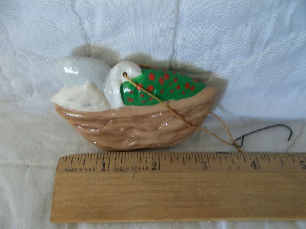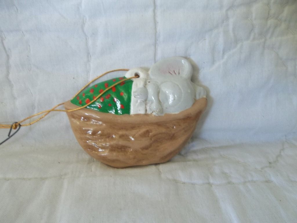 mouse sleeping in half a walnut shell covered with a red and green blanket