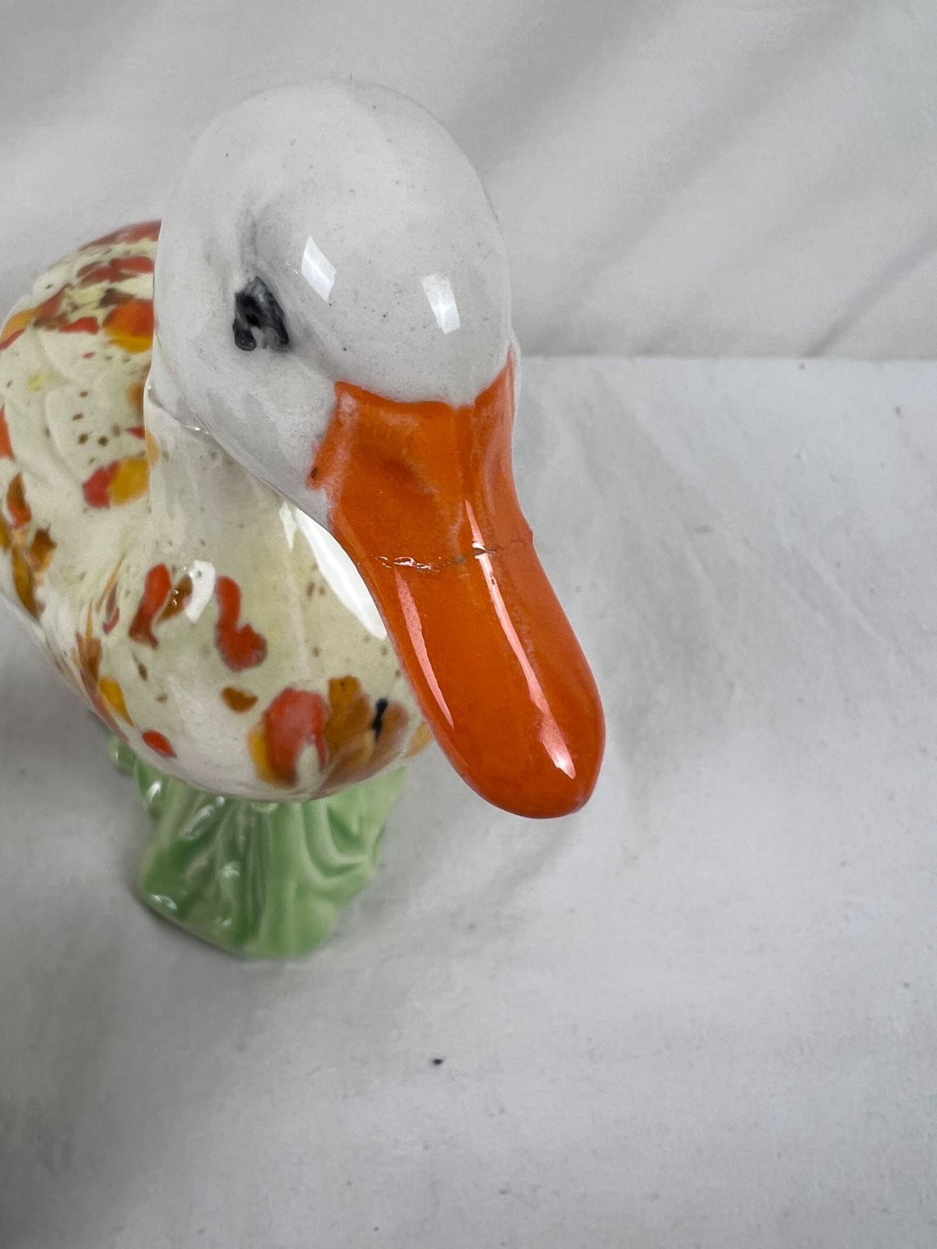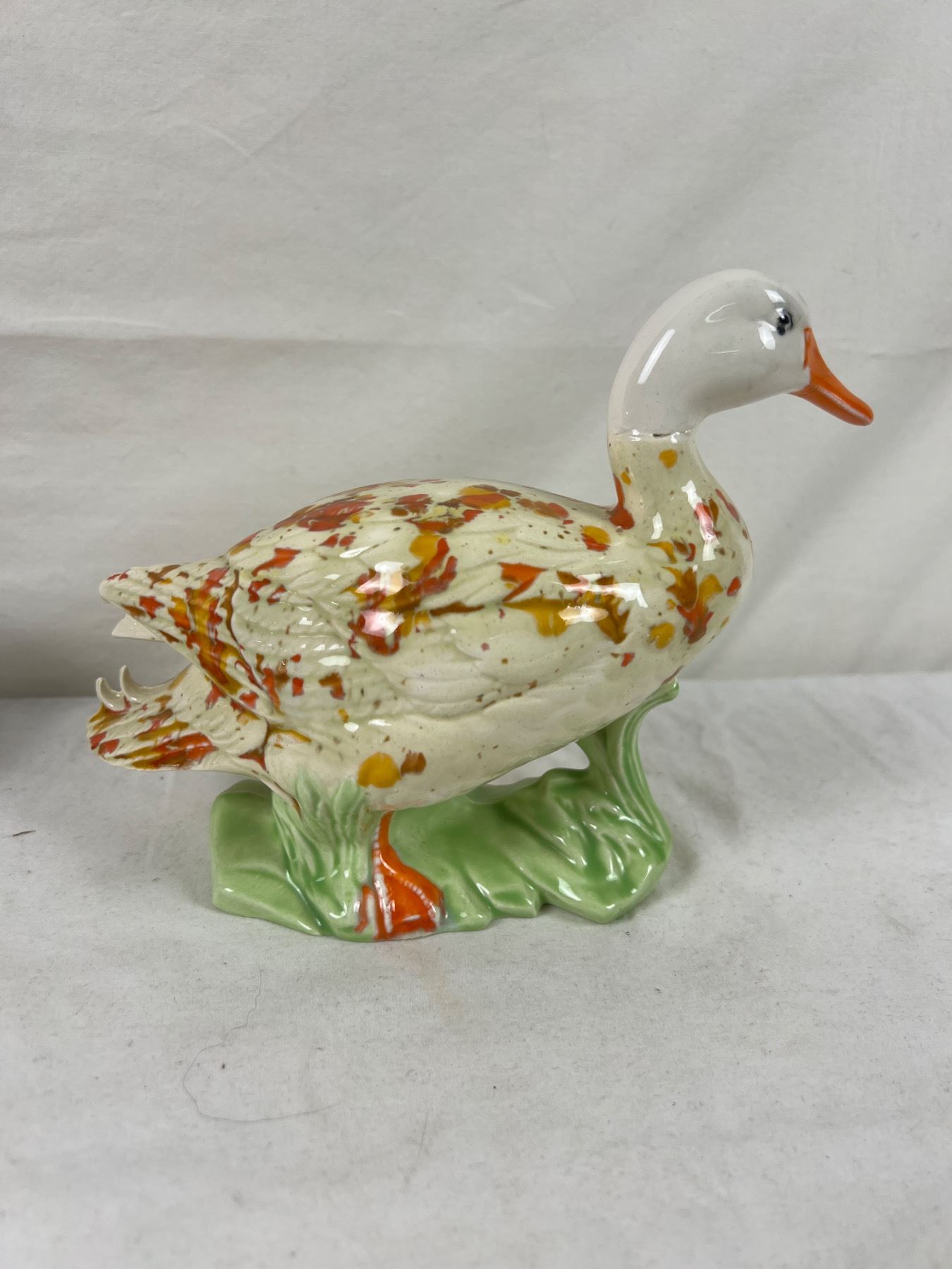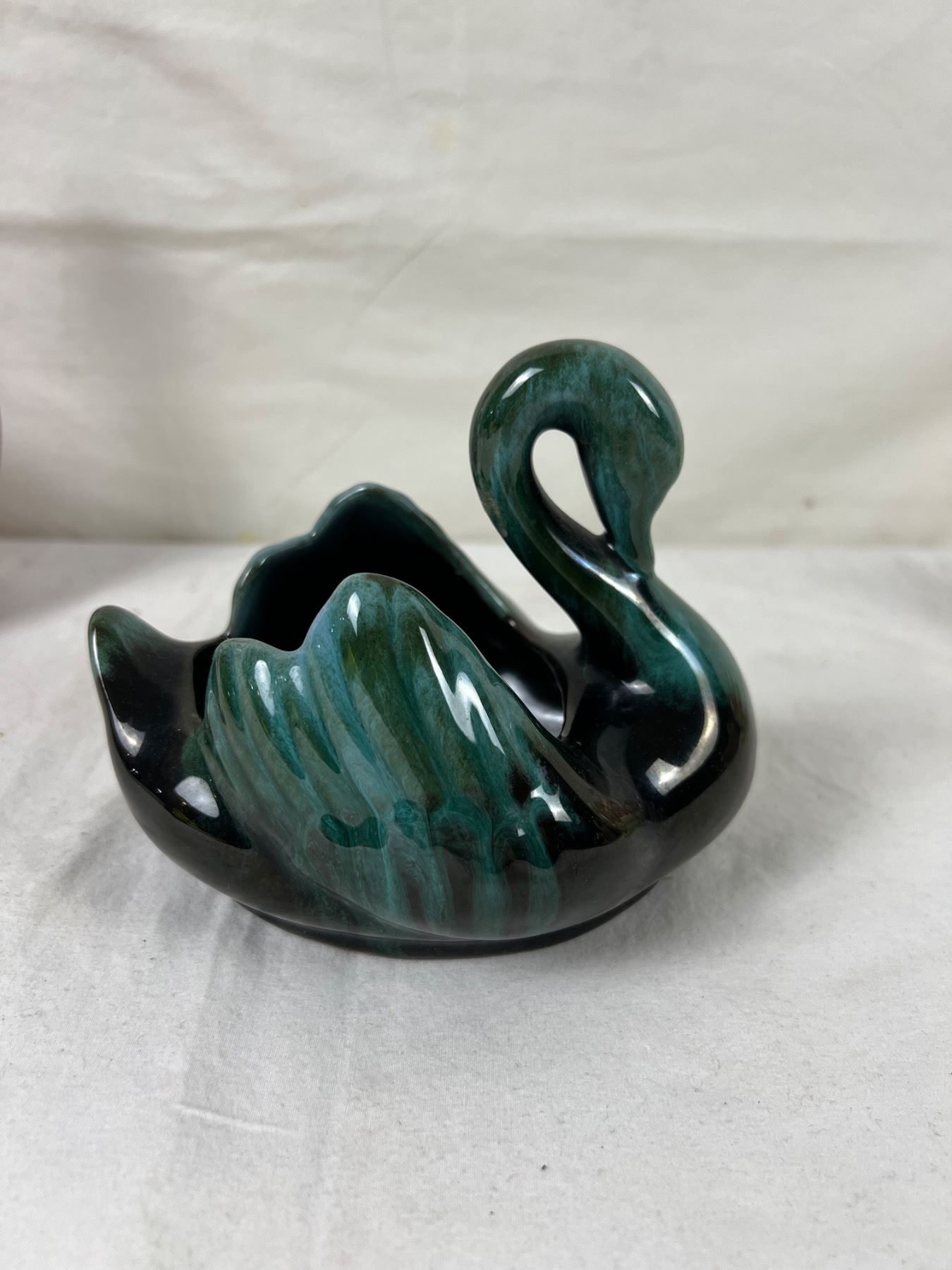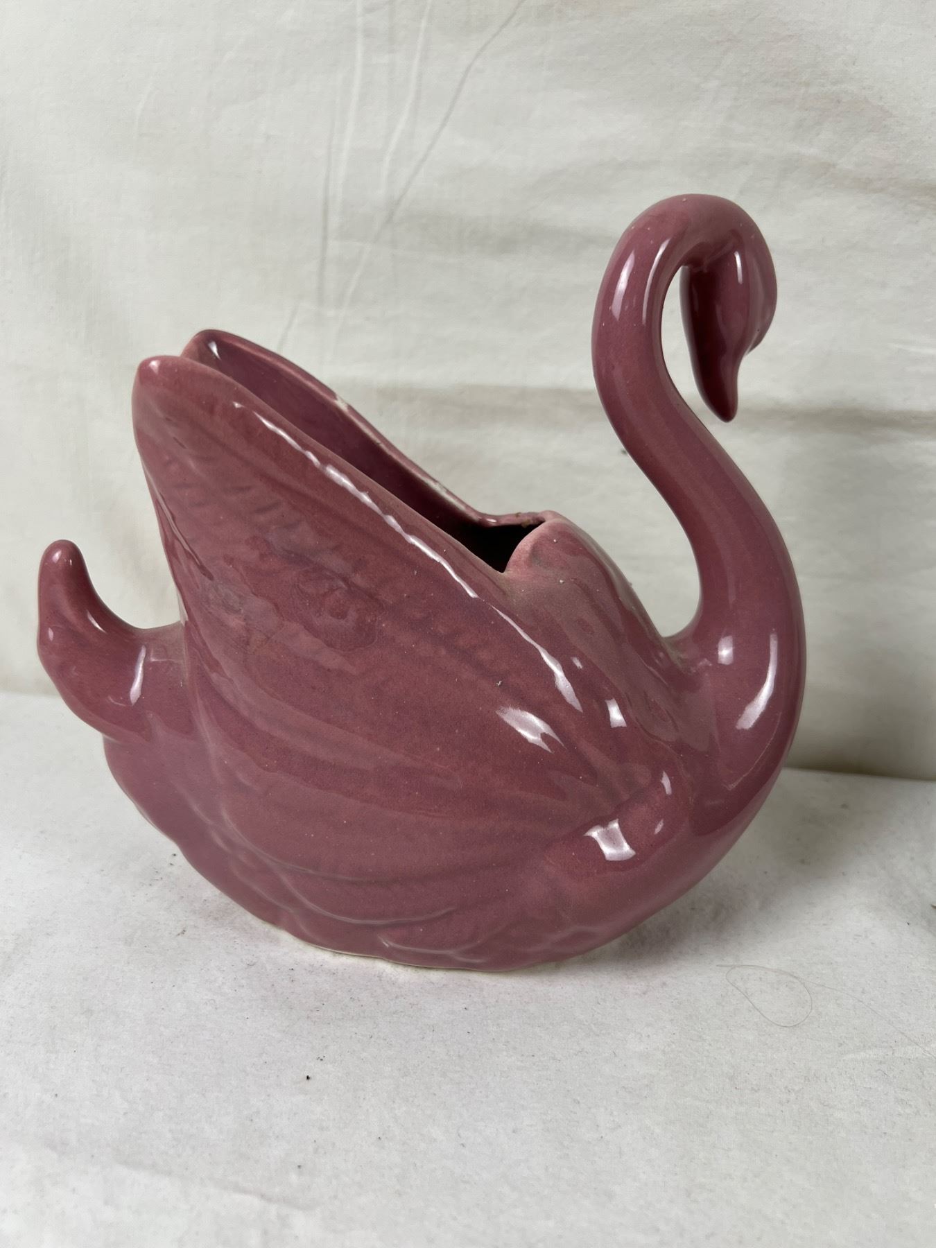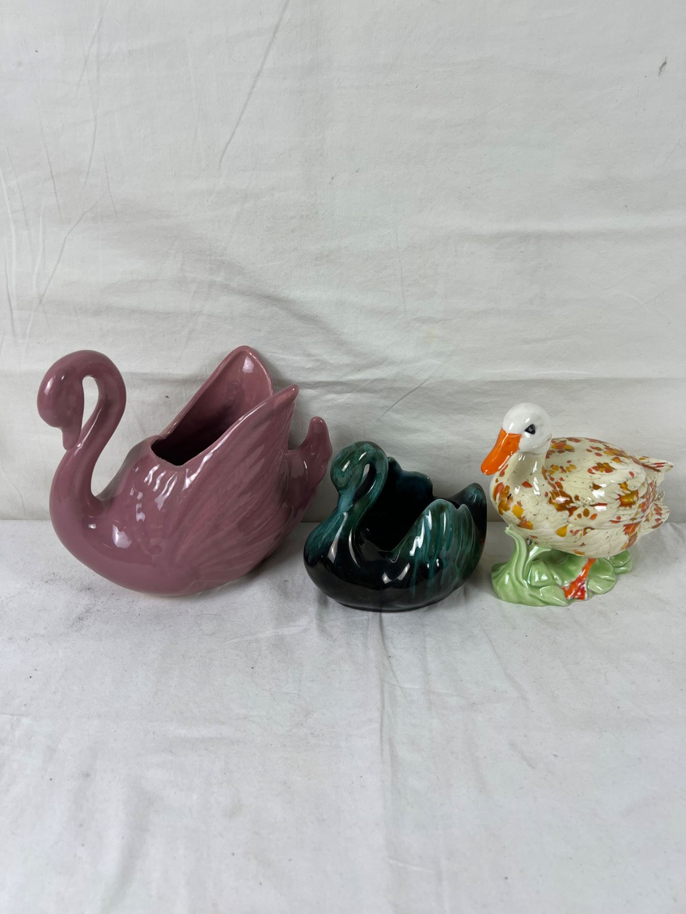 Swan in middle is Blue Mountain Pottery. Duck has had his bill broken off. Pink swan measures 8" tall and wide.