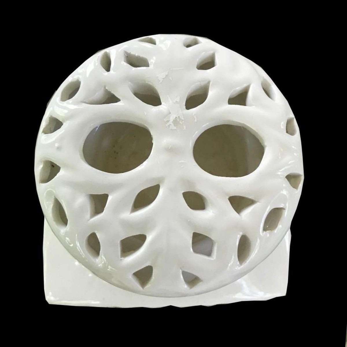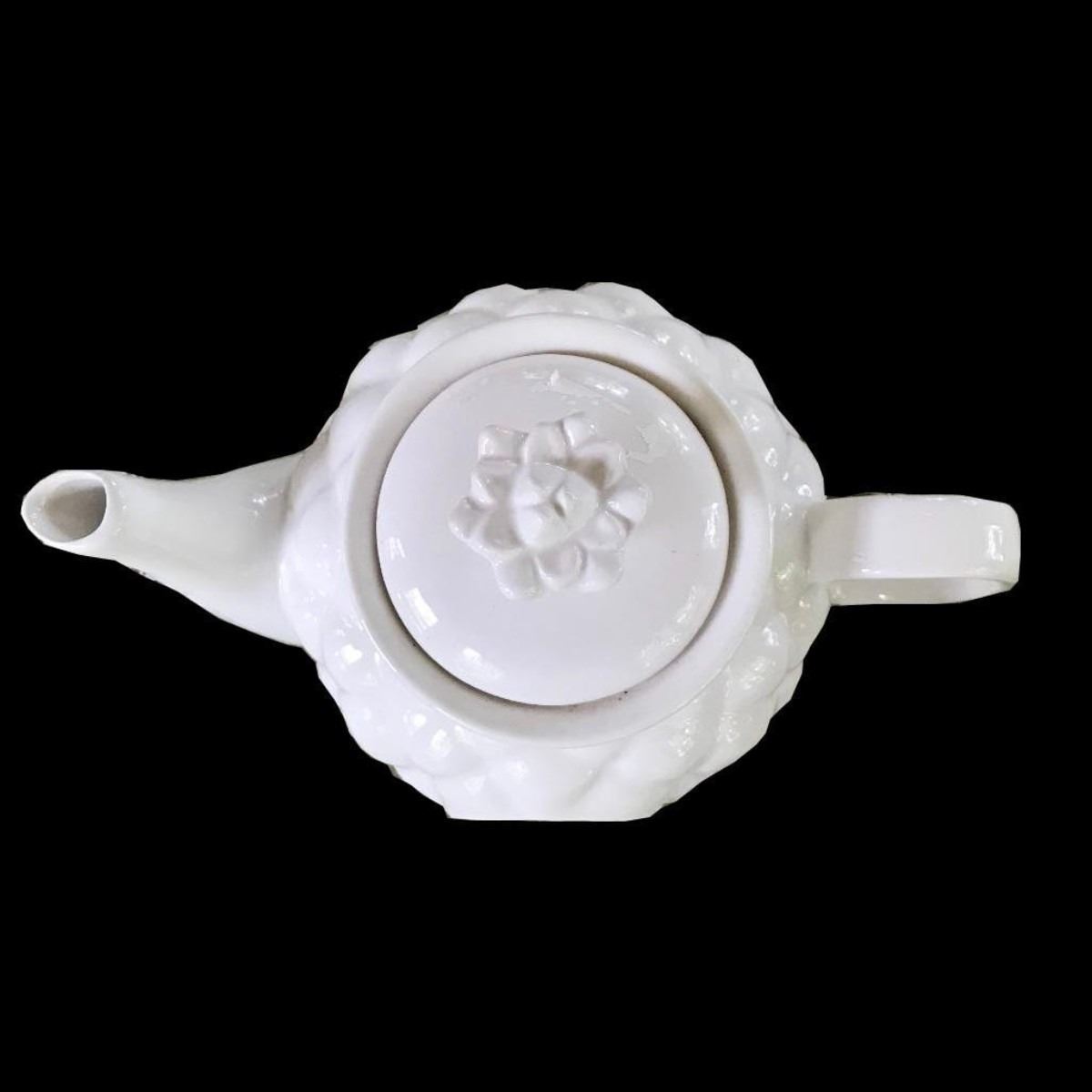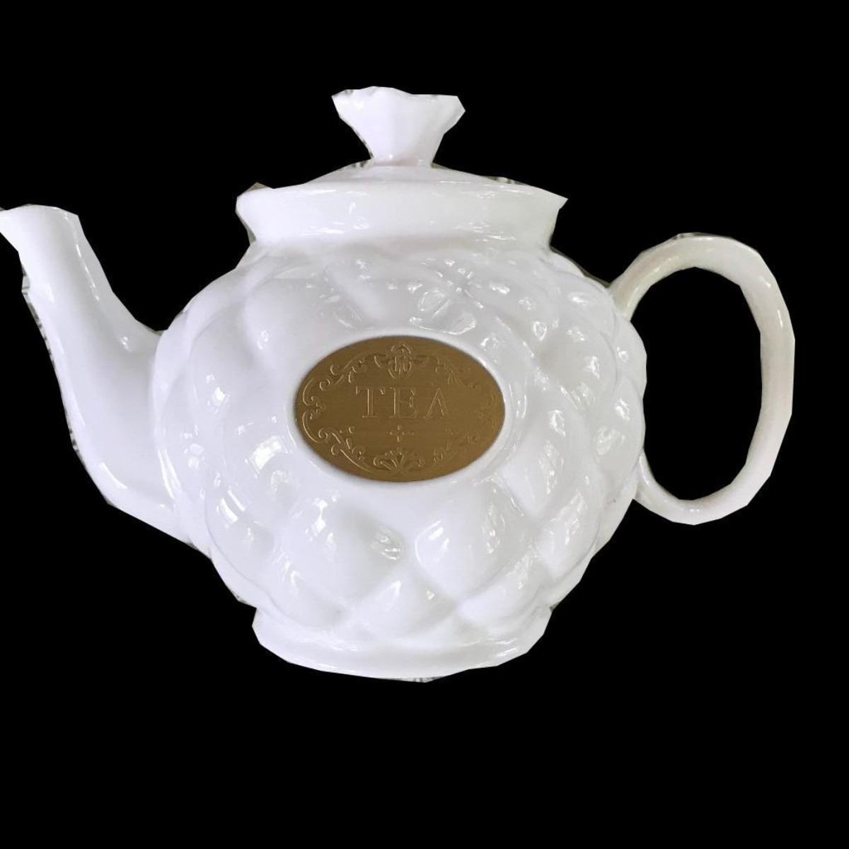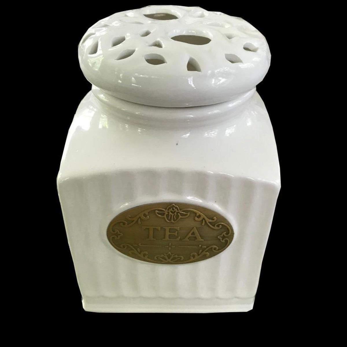 White ceramic tea pot with matching tea caddy canister set. Pineapple shaped tea pot with ornate lgold "TEA" stamped plate, along with a matching tea caddy, canister with pierced top & gold stamped "TEA" plate.Â