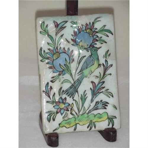 5" x 3 7/8" hand painted under glaze ceramic tile with crazing. (Unmarked)Bird and floral design.