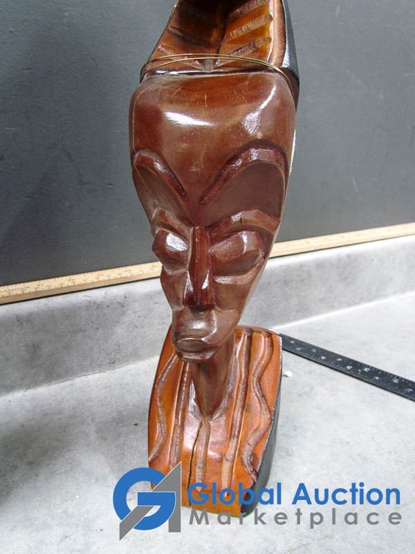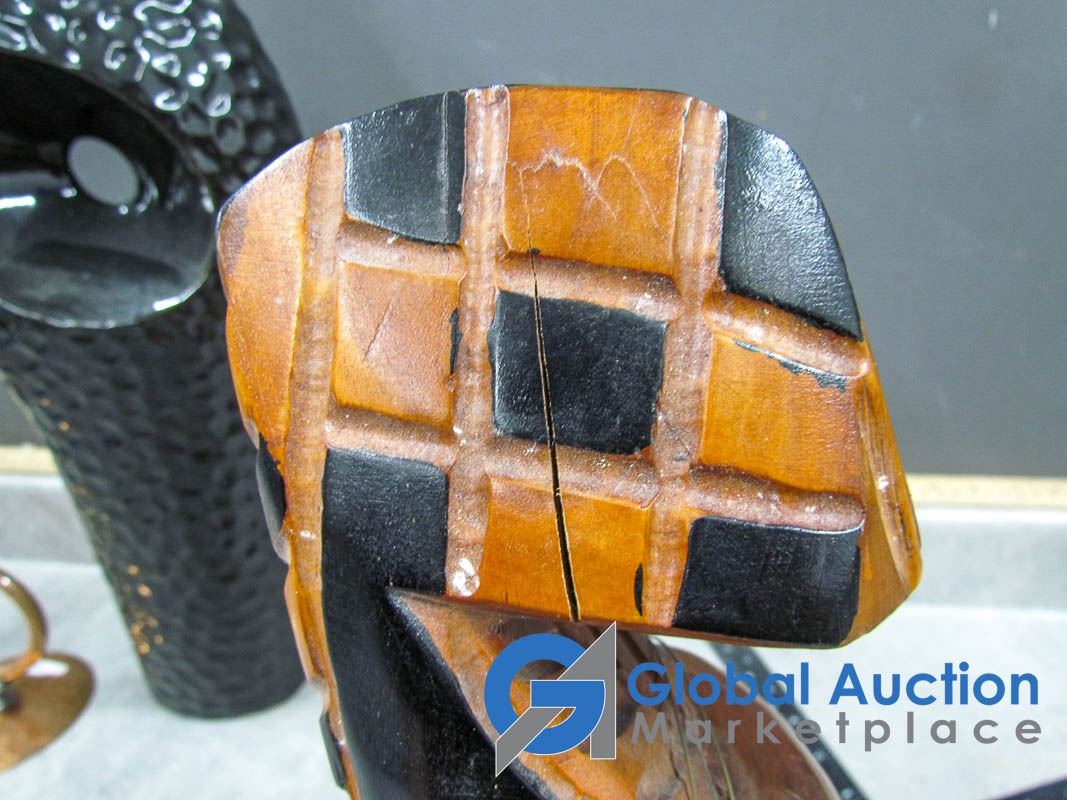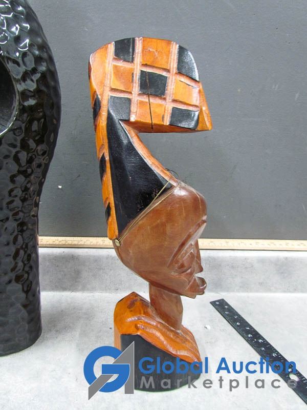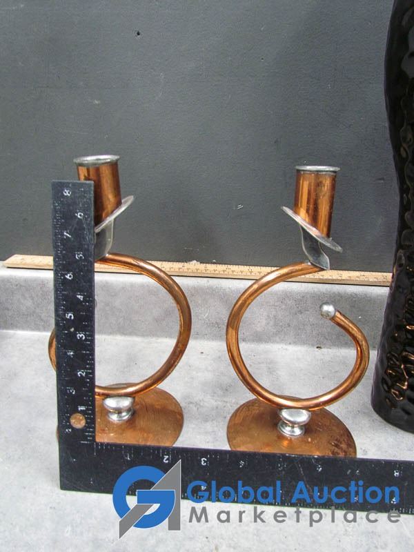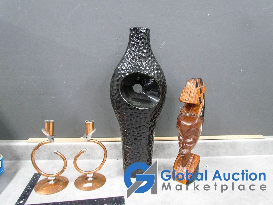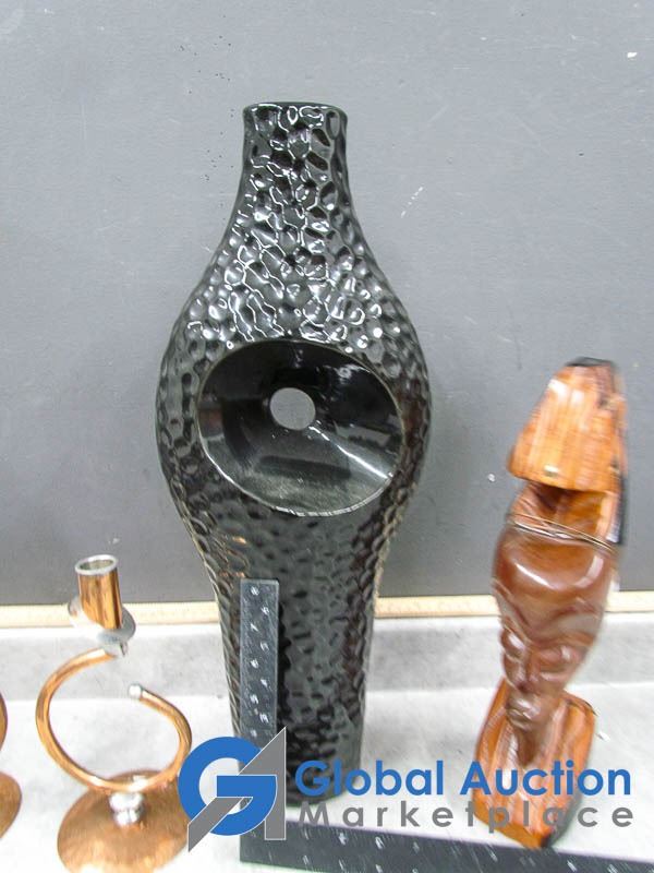 Ceramic Vase, Wood Carved Statue and Copper Candle Sticks