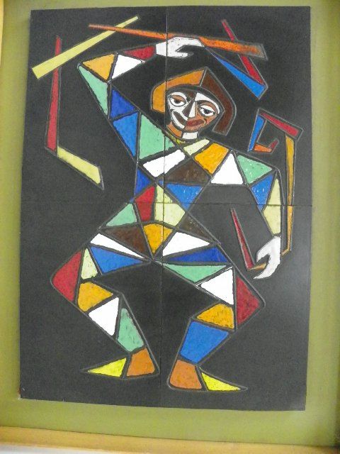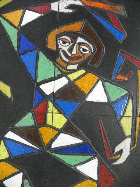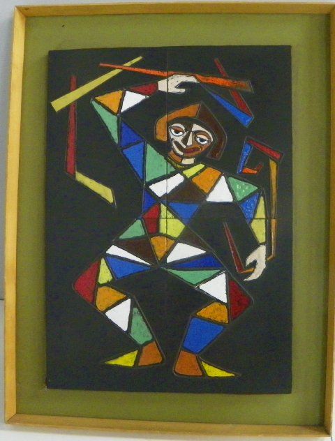 Mid century "Harlequin" made up of approx. 74 tiles. Approx. 20" x 28" image, 26.25" x 34.25" framed. From a Rye, NY estate. Please read our terms of sale.