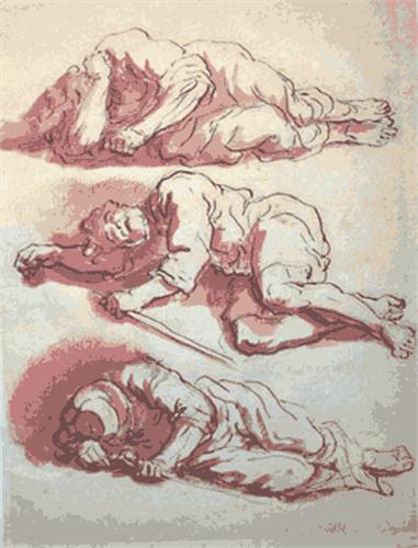 Cercle ou suiveur de Salvator ROSA (1615-1673).- Étude de 3 figures masculines couchées. 17e siècle. Plume d'encre noire et lavis de sanguine sur papier vergé, collé (182 x 142 mm). Sous passe-partout.