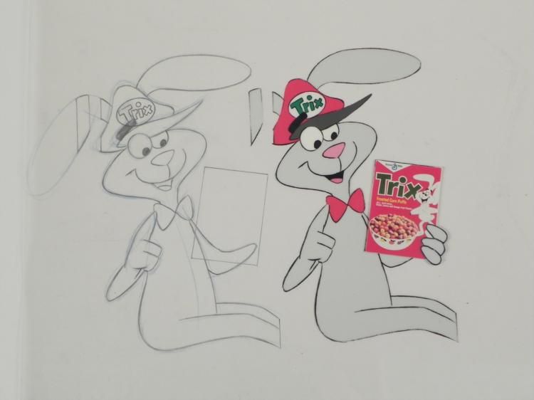In this cel/drawing, the Trix rabbit has a box of Trix frosted corn puffs in his hand. This original animation cel & drawing are from the production of the Trix cereal commercial. * * * * * * Original Animation Cel & DrawingMedium: Hand painted acetate celDetails: Animation notations and peg holes * * Original "rough" animation drawing, in non-photo blue and black pencil * * Size of cel: 10 1/2 x 12 1/2 inchesSize of drawing: 10 1/2 x 12 1/2 inches * * Condition: Very good * This is an original hand-painted cel set-up used in the production of the "Trix Cereal Commercial." Each one-of-a-kind set-up represents a slight change in position of the characters. When individually photographed and projected in rapid succession, the images * appear to move. To created production cels, the original animator's drawing is transferred onto an acetate cel (by hand-inking and/or photo copying). The cel is then hand-painted on the reverse side. The Trix cereal box is a cardboard cutout, that was taped * to the cel. * * * * Traditional animation is a multi-step process which includes various types of art techniques. Drawings are a key part of the process, in which the animator creates the design and movement of the characters. Drawings are then transferred onto acetate cels (by * hand-inking and/or photo copying) to create a production cel, which is then hand painted on the back side, using paint colors chosen and approved by the creator of the series.