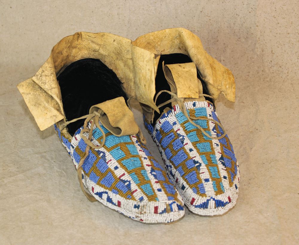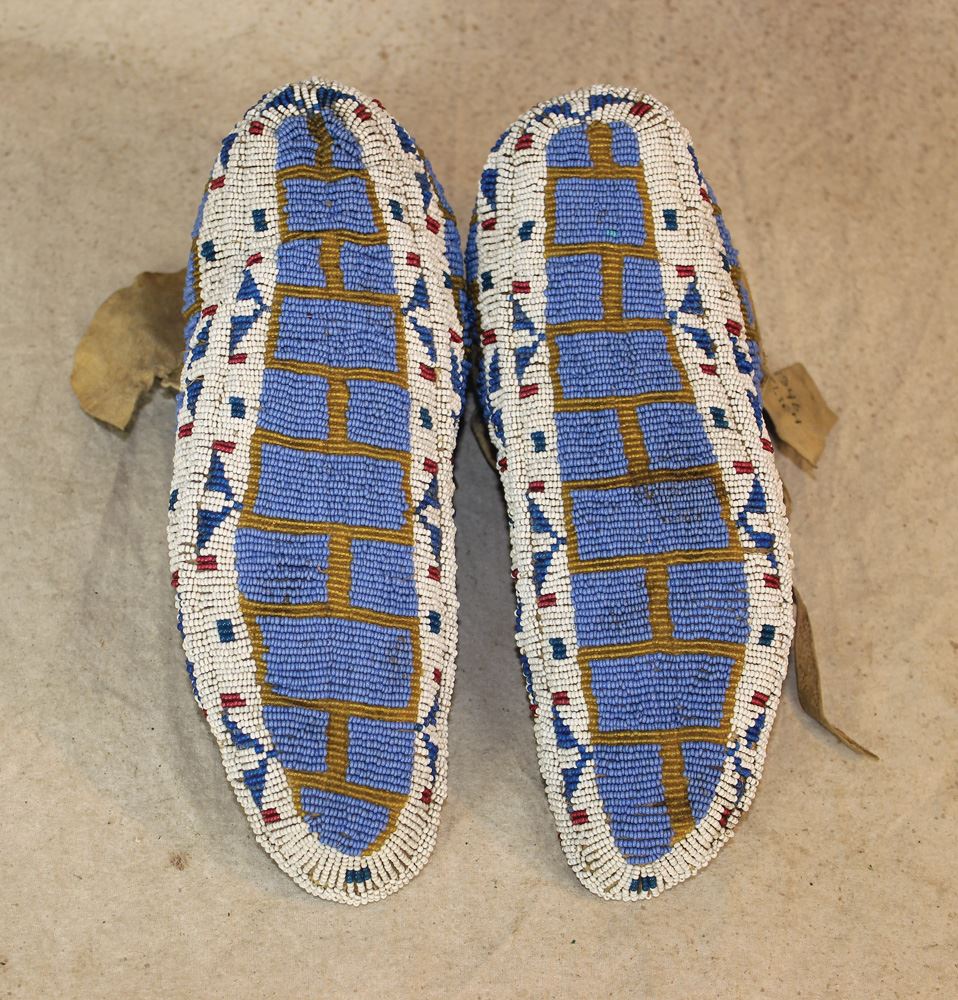 Showy sinew sewn pre 1900 Sioux Indian buffalo hoof design Ceremonial Moccasins with an excellent color pallet that features six bead colors, to include 3 blue variations, powder, sky, medium blues, blended in a white background with red white hearts, accented with translucent amber beaded inter bordering. Measurements are approx. 9 1/2ÒL . Excellent patina, beautiful eye appeal.