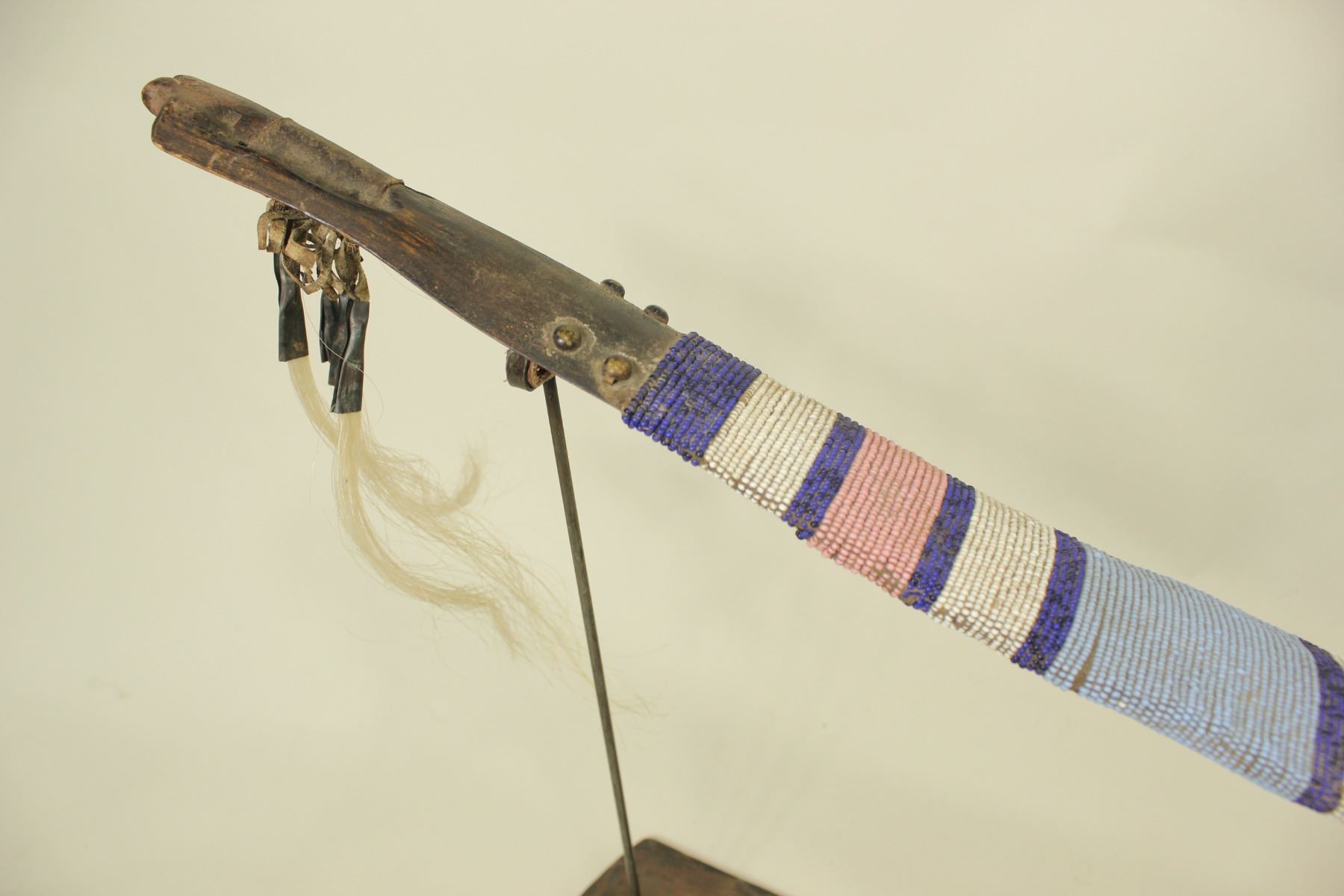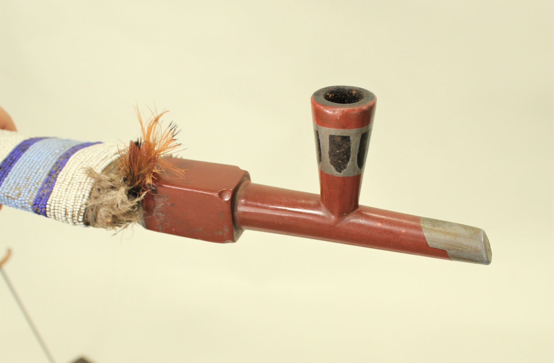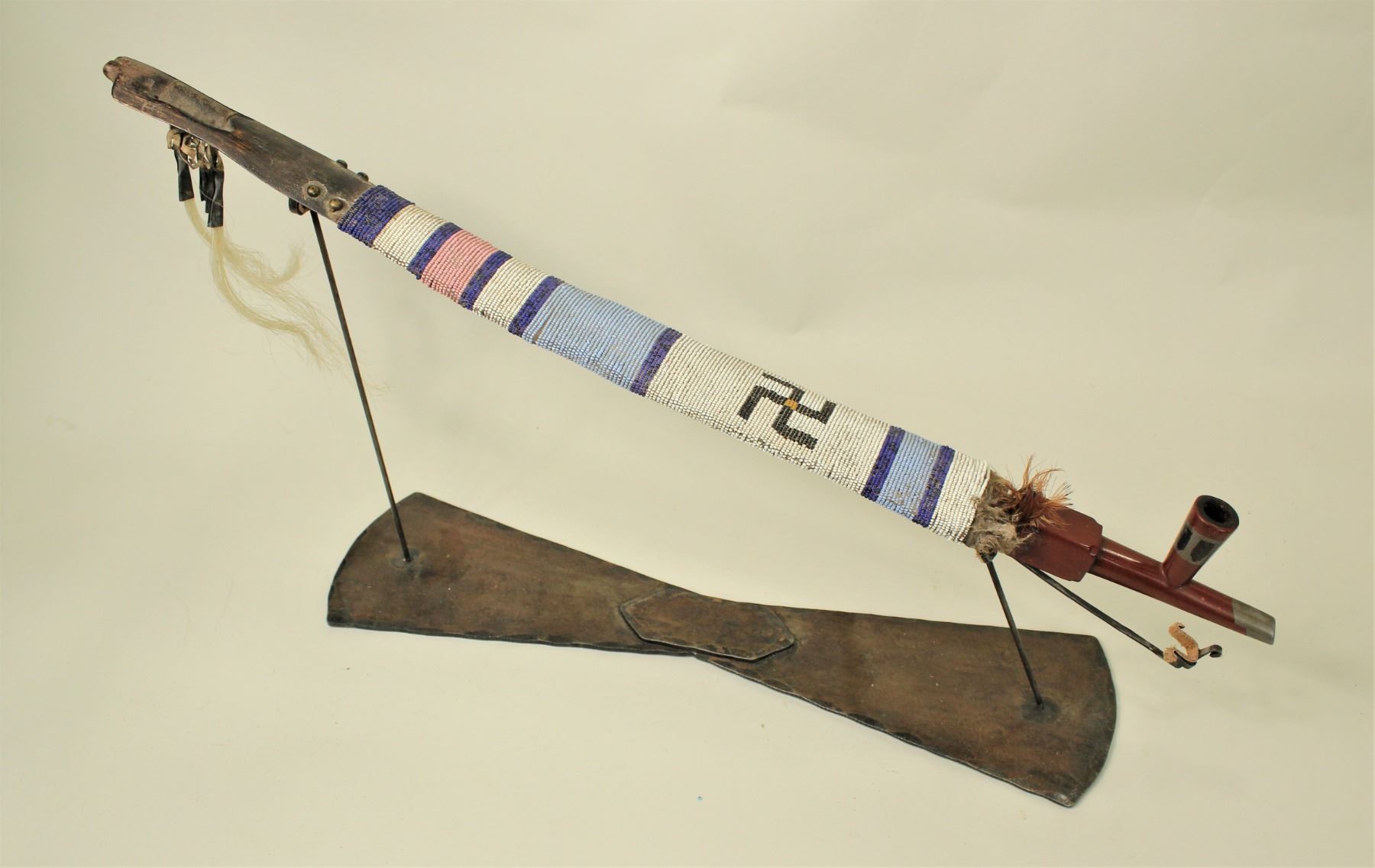 Wonderful much used pipe with nearly full length beadwork that includes early blue and Crow pink beads incorporating a metallic bead whirling log good luck symbol, well worn brass tacks, feathers, horsehair tinkle cones and topped off with a small beautifully fine inlaid catlinite bowl.