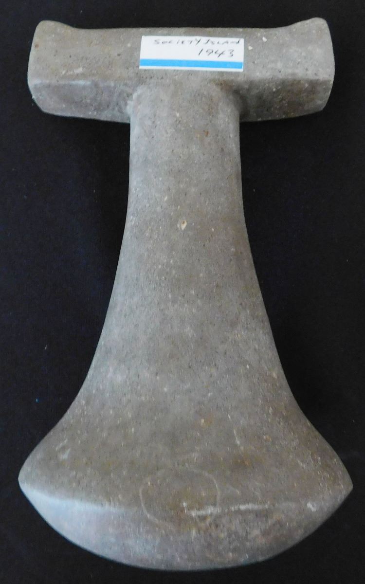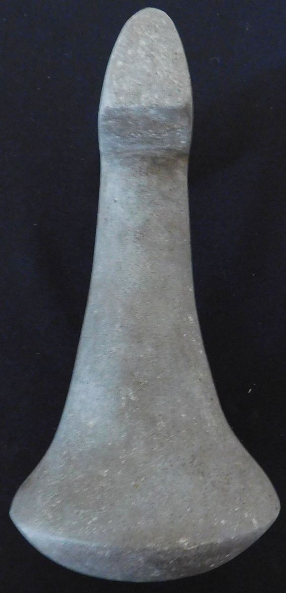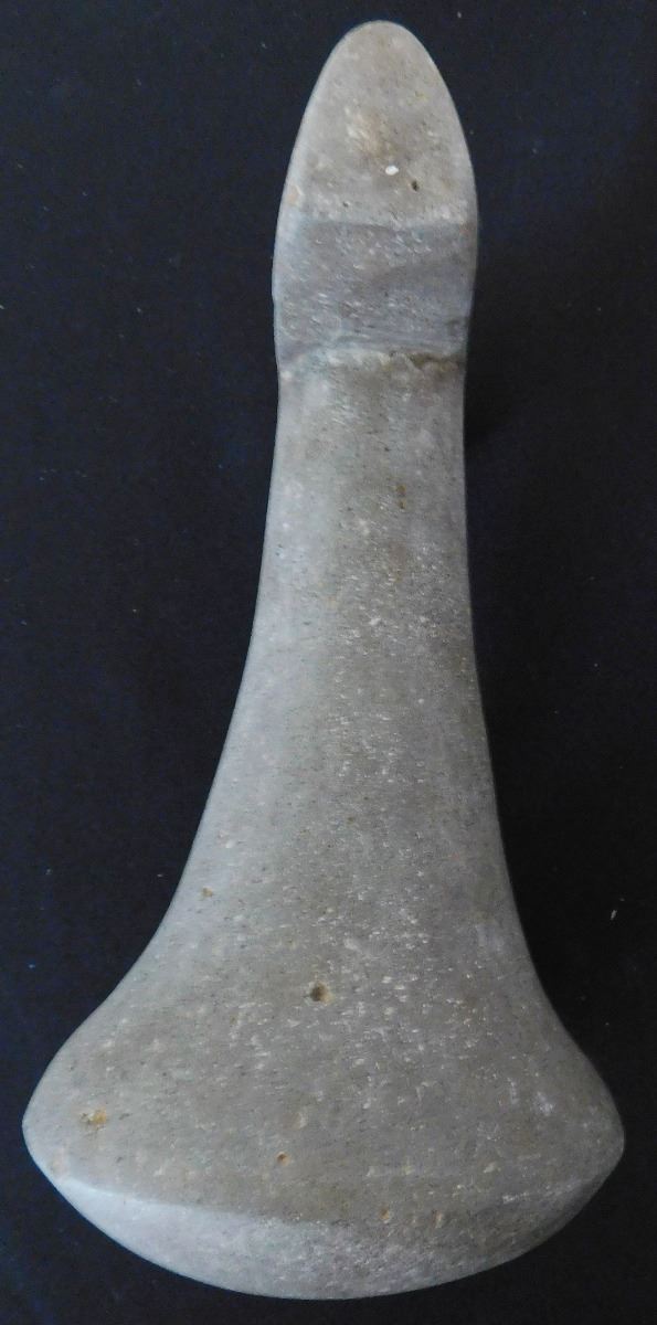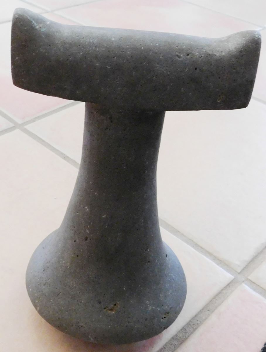 Ceremonial Poi Pounder, pre-historic item, made from basalt and measuring 9 x 5 x 5 inches. From Society Island. It has unusual features on bar top, very rare! Condition: Good, see images. Shipping: $45.00 w/insurance.