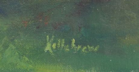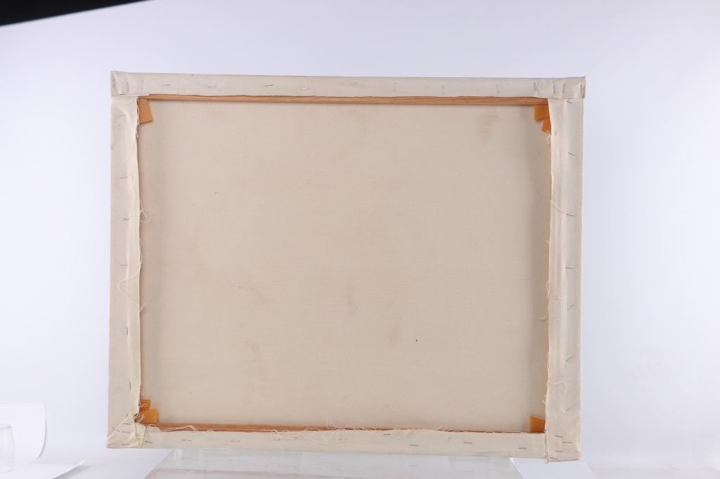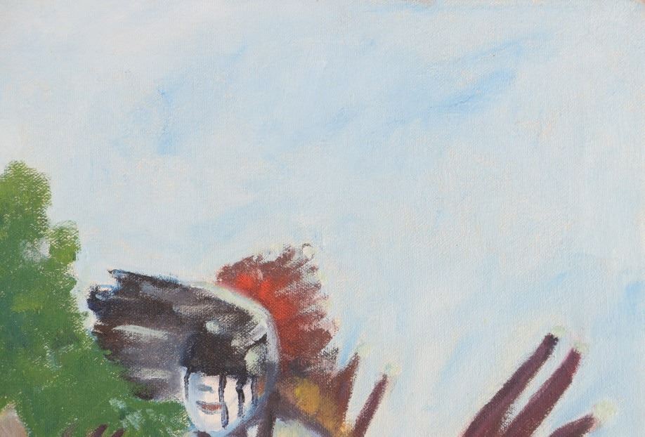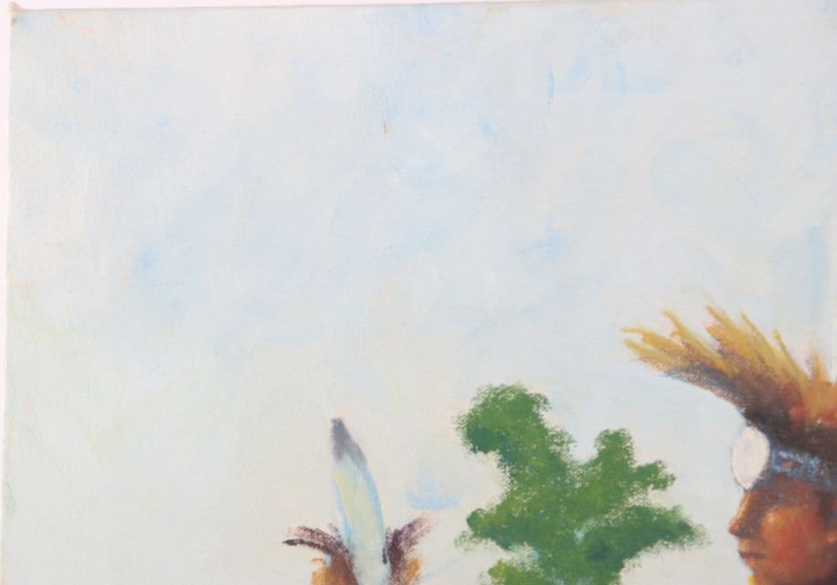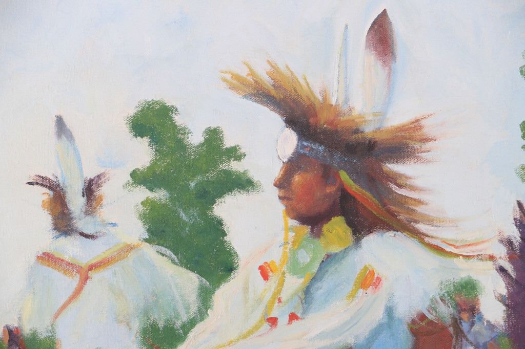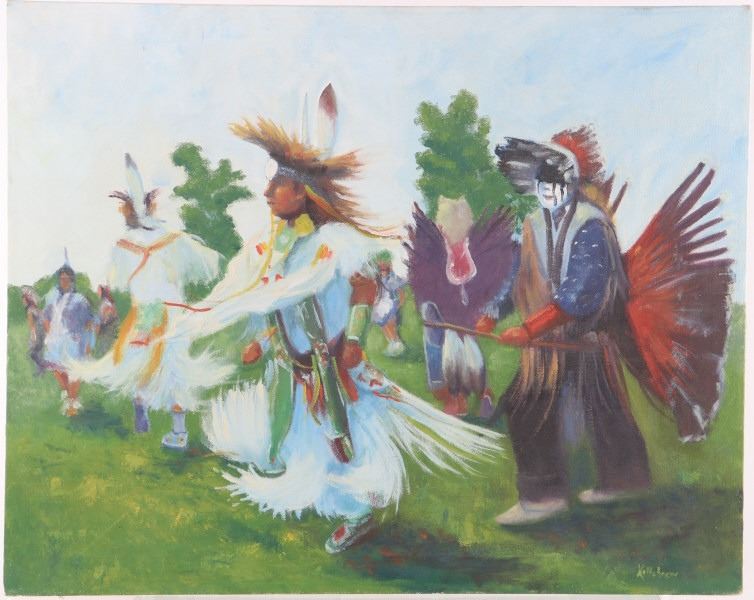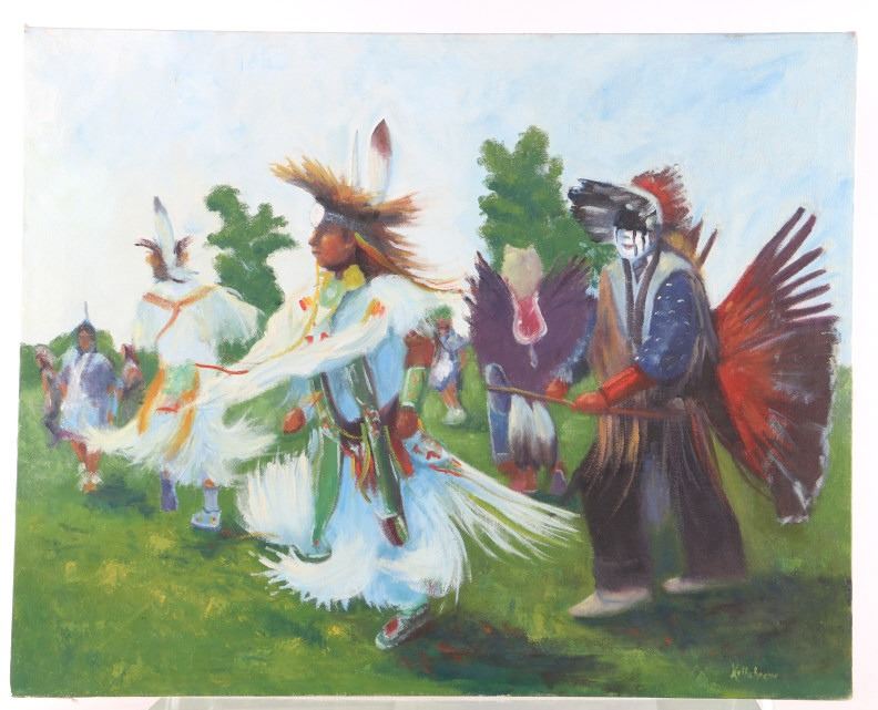 Featured in this lot is this Ceremonial Spirit Dance oil painting on canvas. The oil painting shows wonderfully and professionally crafted oil painting on canvas with a pine wood frame and shows the canvas stretched and attached to the frame. The artwork features Native men dressed up in ceremonial garment all dancing around in a clearing with trees in the distance and a clear sky overhead. The condition of this oil on canvas is good with no obvious signs of damage and in good overall condition. The measurements of this artwork are 24" x 30".