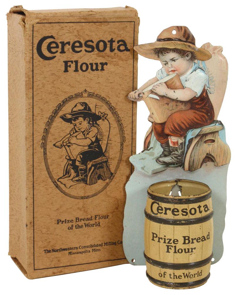 Ceresota Flour match holder w/box, litho on embossed tin, VG+ to Exc cond w/a few minor paint chips on boy's arms, 5.5"H x 2.5"W.