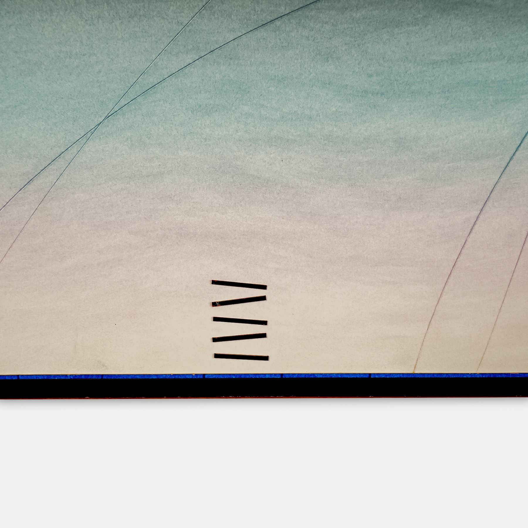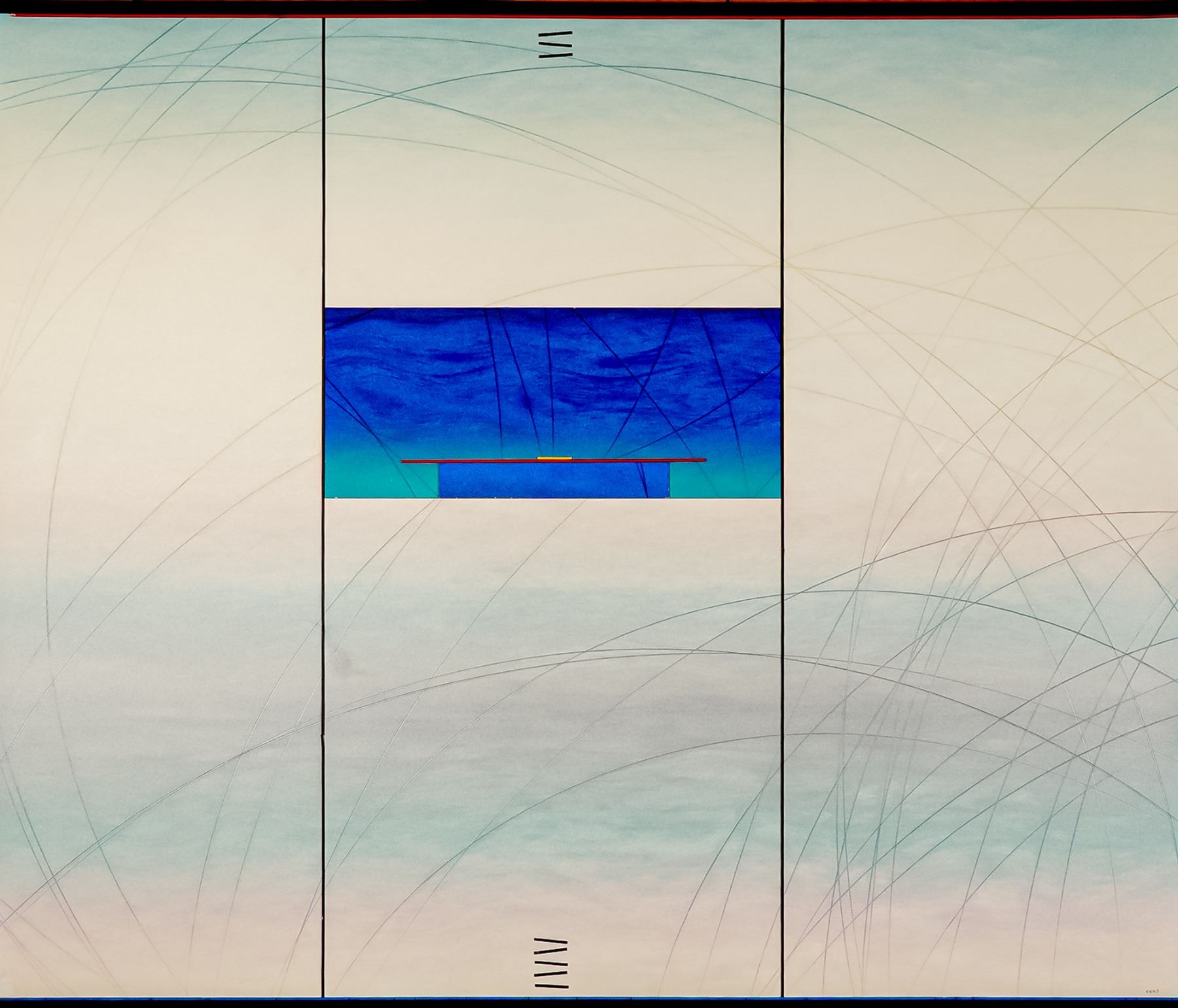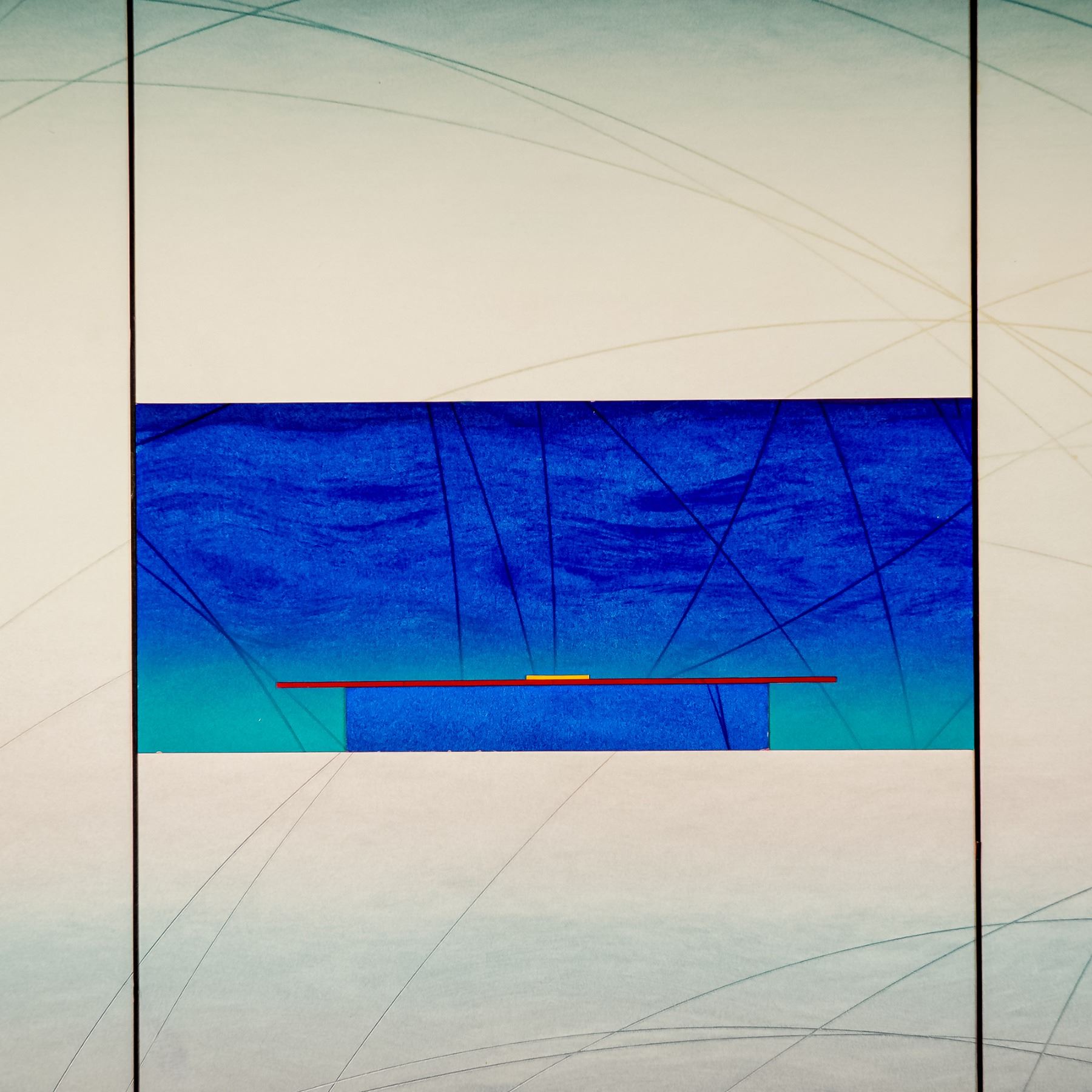 A captivating mixed media composition with gouache on paper board by Canadian artist Cerj Lalonde. The work features a masterful interplay of geometry, balance, and color, anchored by a deep blue central form that resonates with Lalonde's signature exploration of space, movement, and harmony. The composition is accented with subtle curved graphite lines and carefully placed linear pieces, evoking both mathematical precision and lyrical abstraction. The artist's hand is evident in the delicate gradients and confident structuring, producing a work that feels simultaneously meditative and powerful. Cerj Lalonde is known for his refined minimalist and geometric abstract paintings, in which he often explores themes of time, balance, and rhythm. His works are celebrated for their elegance and structural clarity, bridging the worlds of modernist design and contemplative fine art. Lalonde has exhibited extensively, and his pieces remain highly collectible among contemporary art enthusiasts. Signed lower right in graphite