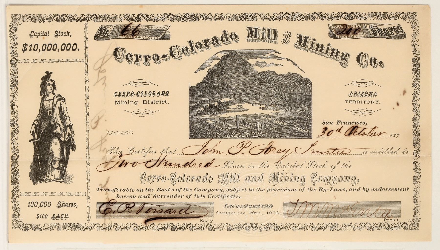 Cerro-Colorado Mining District, Arizona Territory, c1876. No. 66, 200 shares, issued to John P. Arey Trustee, on Oct. 30, 1876. Signed by president and secretary. Not cancelled. 4.75 x 9" Nice vignettes, including the mill with mountains behind. The Cerro Colorado Mine (also known as the Heintzelman Mine and the Silver Queen Mine) is located in the Cerro Colorado Mountains, Pima County, Arizona. During the Civil War, soldiers that were protecting the area against Apache Indians were removed from Arizona leaving the area unprotected. After the troops left, the mining camps were under constant attack from the Apache. Soon after, Mexican miners stole whatever they could, including $70,000 worth of silver bullion, and as the story is told, buried all the bounty in the nearby hills. Mexican outlaws hearing the tales headed toward Cerro-Colorado and completely destroyed the town and mining camps, killing most of the workers, looking for buried treasure. To this day, the treasure has not been located, and the name given to this entire story is the "Treasure of the Cursed Cerro Colorado". By 1883 there were fewer than 100 people left at Arivaca, according to McKenney's 1883-84 Directory, with a hotel, 2 saloons and a brewery, one grocery store, a general merchandise store, blacksmith and butcher.