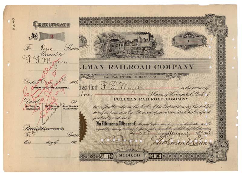 1906, Illinois. Stock certificate # 2 for one share. Black / White. Vignette of a locomotive exiting a tunnel at top center. Gold embossed seal. Stub glued to left edge, obscuring about one fifth of certificate. Punch and pen cancelled. Very slight edge wear. Overall Very Fine. RARE!