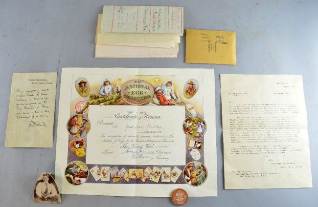 Certificate of Honour and badge for Egg Collection for the Wounded during The Great War. Awarded to Miss Mary Woolstop of Penzance, certificate signed by Chairman and the Secretary of the National Egg Collection for the Wounded (folded). Collector badge with original pin (4cm). Along with a letter to the War Office from B.B. Cubitt the Hon.Director of the National Egg Collection for the Wounded praising the work of the organisation in collecting "something approximating 41,000,000 eggs" during the war. A handwritten note thanking Miss Woolstop for her work sending eggs for the wounded on paper headed GENERAL HEADQUARTERS, BRITISH ARMIES IN FRANCE. A cut out picture of Miss Woolstop, a set of her business cards(3), Apprentice Indentures from 1893, letters from Military pensions office in South Africa (4)